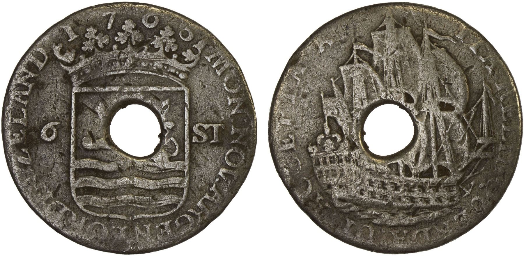 INDONESIA: Bali, AR cash (3.53g), ca. 18th-19th century, made from a 1735 Zeeland 6 stuiver (scheepjesschelling), with round center hole for stringing, extremely rare, F-VF. See our Auction 53, Lot 3481 for a similar example.East Asian cash coins (known locally as pis bolong) circulated widely in Bali for centuries and were still in use well after the introduction of the rupiah. According to the consignor, some Western silver coins were holed in a similar manner for stringing and circulated in Bali and parts of eastern Java.