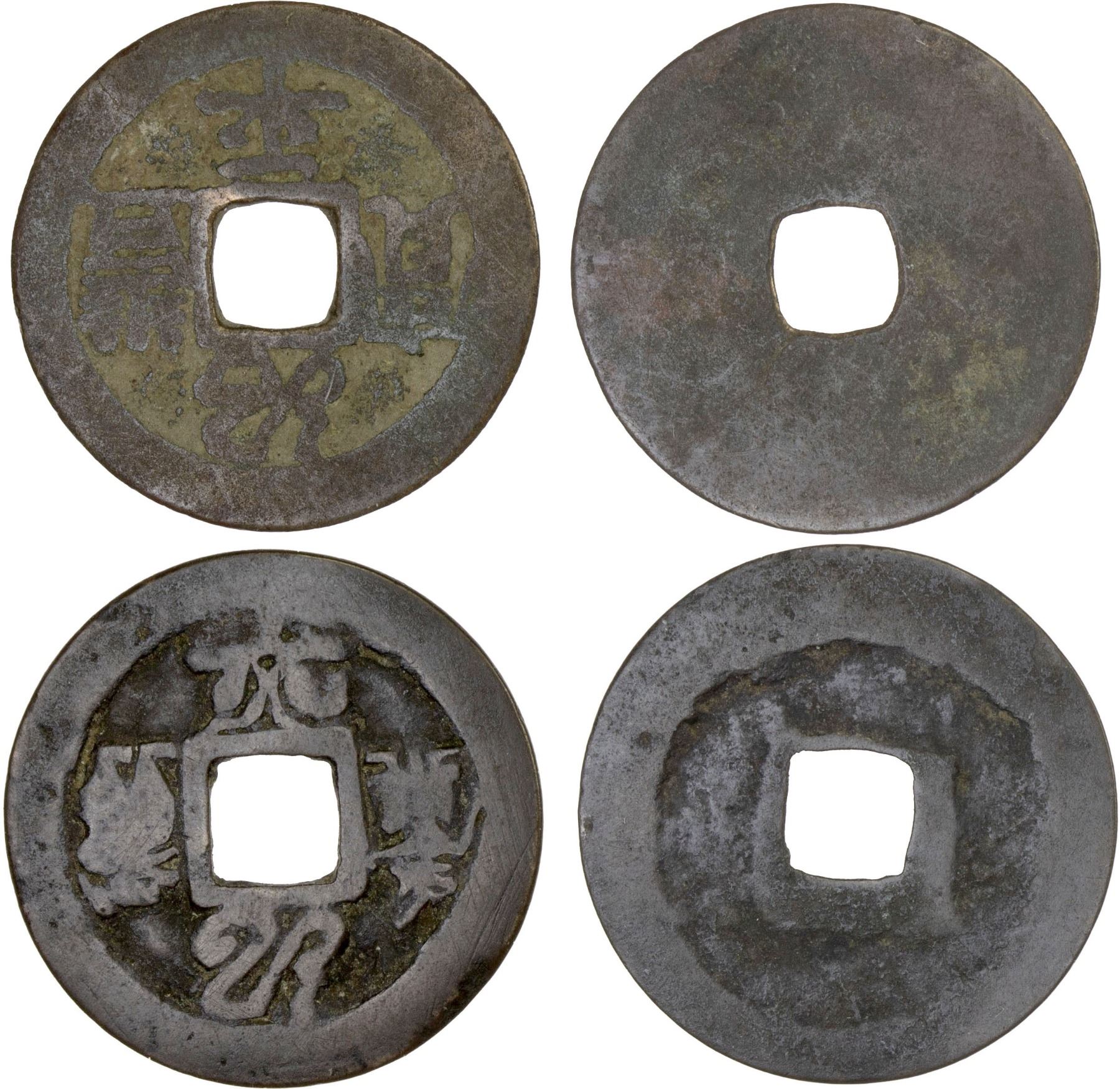 INDONESIA: JAVA: AE charm (1.56g), wayang figures of noble man and male servant to left and right, with Chinese characters shao above and ping below, cast from a mold made from an Annam thieu phong binh bao (Toda-19) with the left and right characters replaced with the wayang figures, accompanied by an example of the Annam coin for comparison; set of 2 pieces, Fine, ex Jürgen M. Wilmes Collection. See Cribb-156a for a similar example with a vestigial Chinese character.