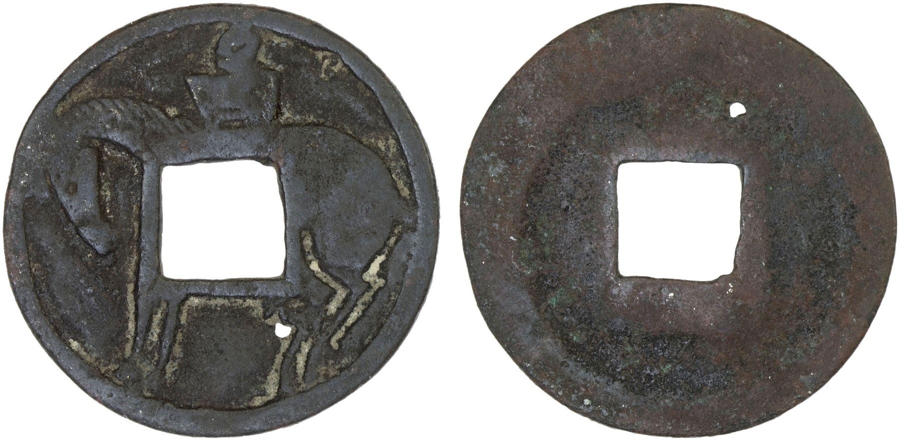 INDONESIA: JAVA: AE charm (2.17g), Cribb-159a (plate example), Series 7, Group 4, noble man riding horse left // blank, small casting hole, F-VF, ex Jürgen M. Wilmes Collection.