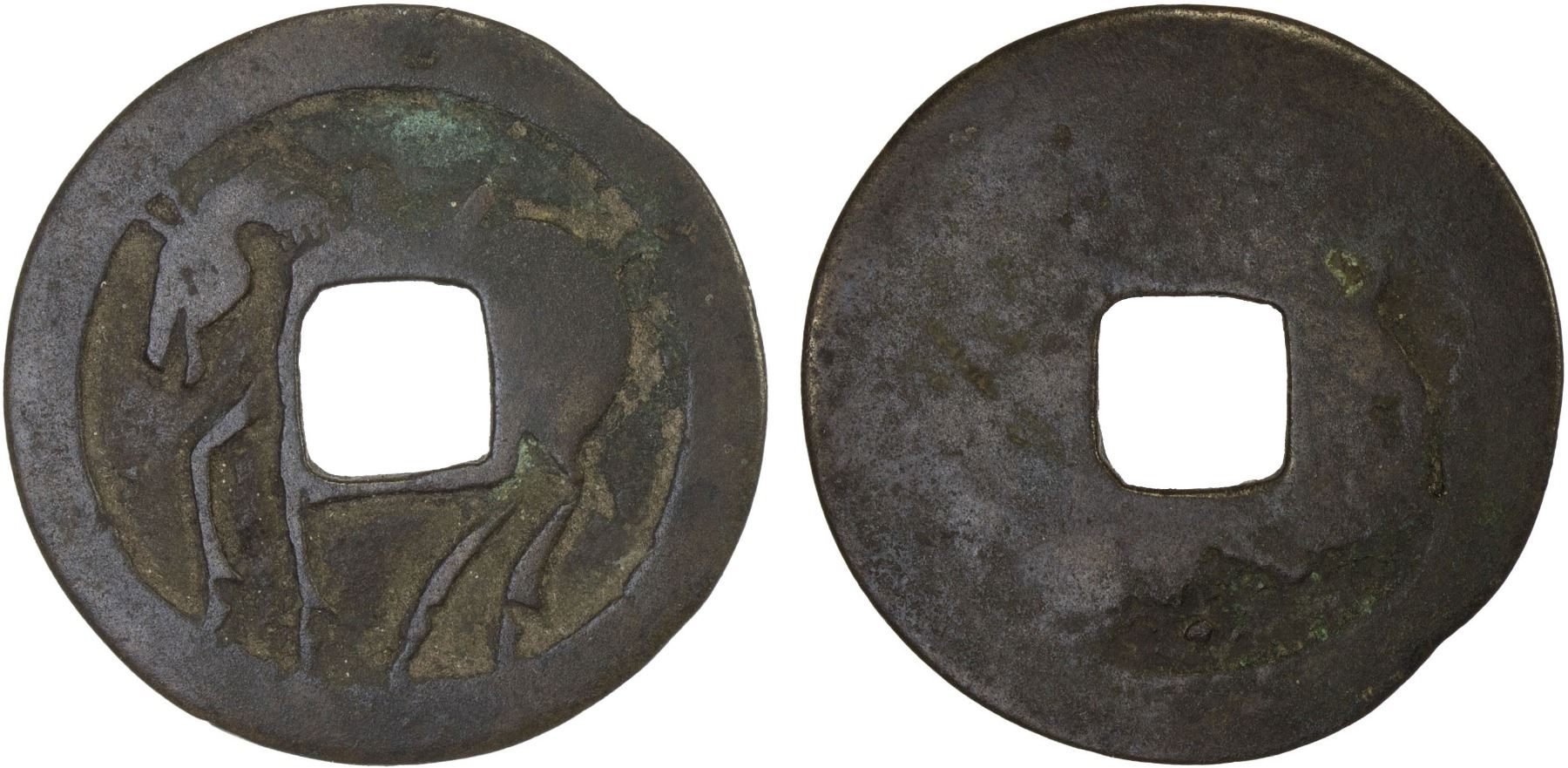INDONESIA: JAVA: AE charm (2.42g), Cribb-164a (plate example), Series 7, Group 5, horse with saddle standing left // blank, F-VF, ex Jürgen M. Wilmes Collection.