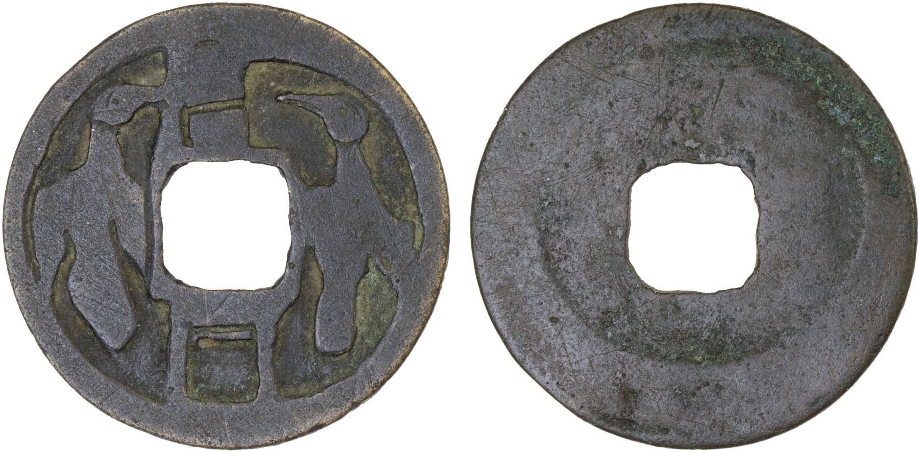 INDONESIA: JAVA: AE charm (2.47g), Cribb-172a (plate example), Series 7, Group 8, two birds flying with heads vis-à-vis, uncertain objects above and below // blank, Fine, ex Jürgen M. Wilmes Collection.