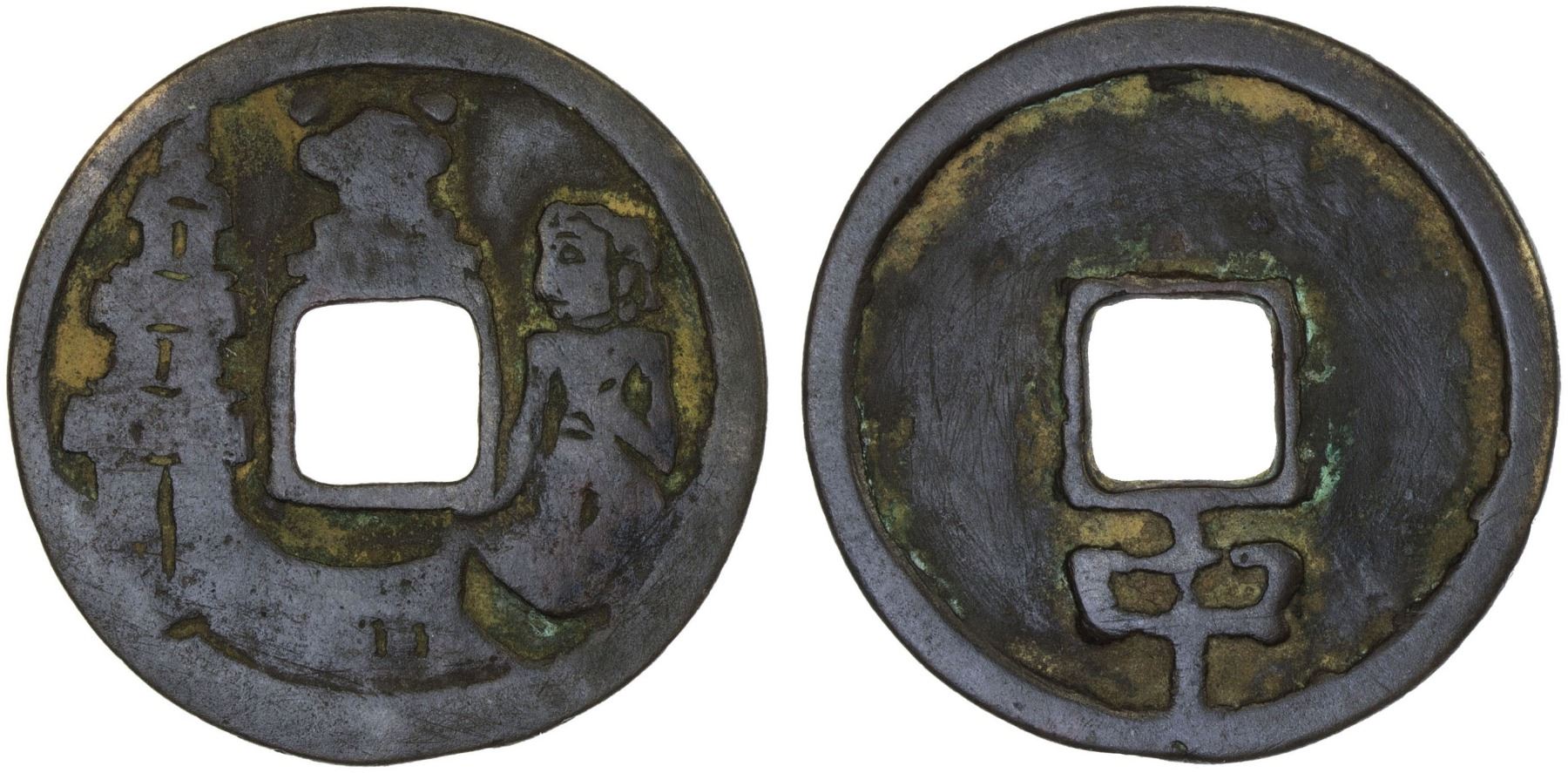 INDONESIA: JAVA: AE charm (2.86g), Cribb-156a (plate example), Series 7, Group 2, noble figure standing left, facing building, uncertain objects above and below // the Chinese character zhong below, a very interesting example, Fine, ex Jürgen M. Wilmes Collection. Cribb notes that the character zhong appears to be a surviving part of the Chinese coin (likely a Da Zhong Tong Bao from 1361-7) from which the mold for this charm was made.