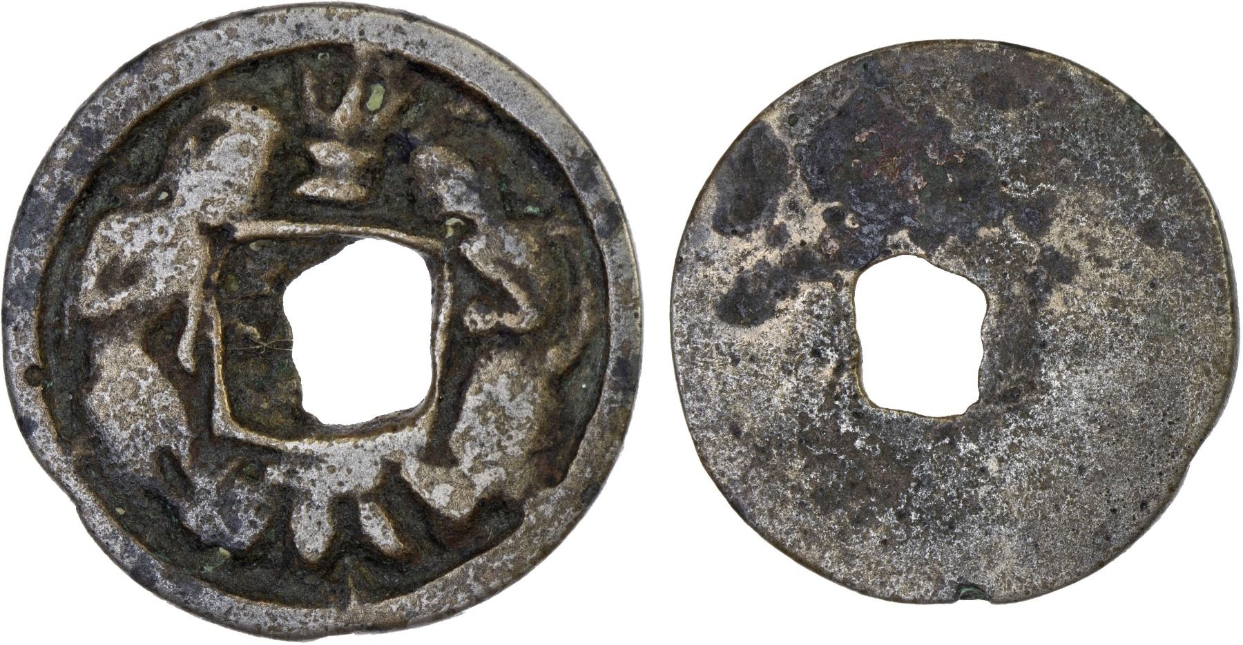 INDONESIA: JAVA: AE charm (3.06g), Cribb-155a (plate example), Series 7, Group 1, two noble figures standing vis-à-vis, uncertain objects above and below // blank, Fine, ex Jürgen M. Wilmes Collection.
