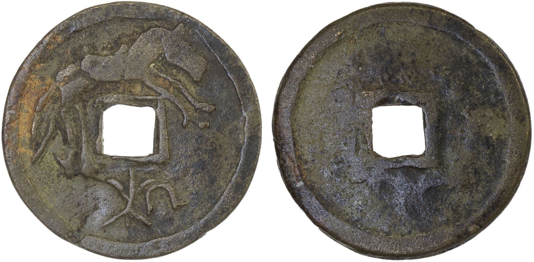 INDONESIA: JAVA: AE charm (4.12g), Cribb-169a (plate example), Series 7, Group 5, horse galloping right above, symbols above // blank, minor planchet flaw, F-VF, ex Jürgen M. Wilmes Collection.