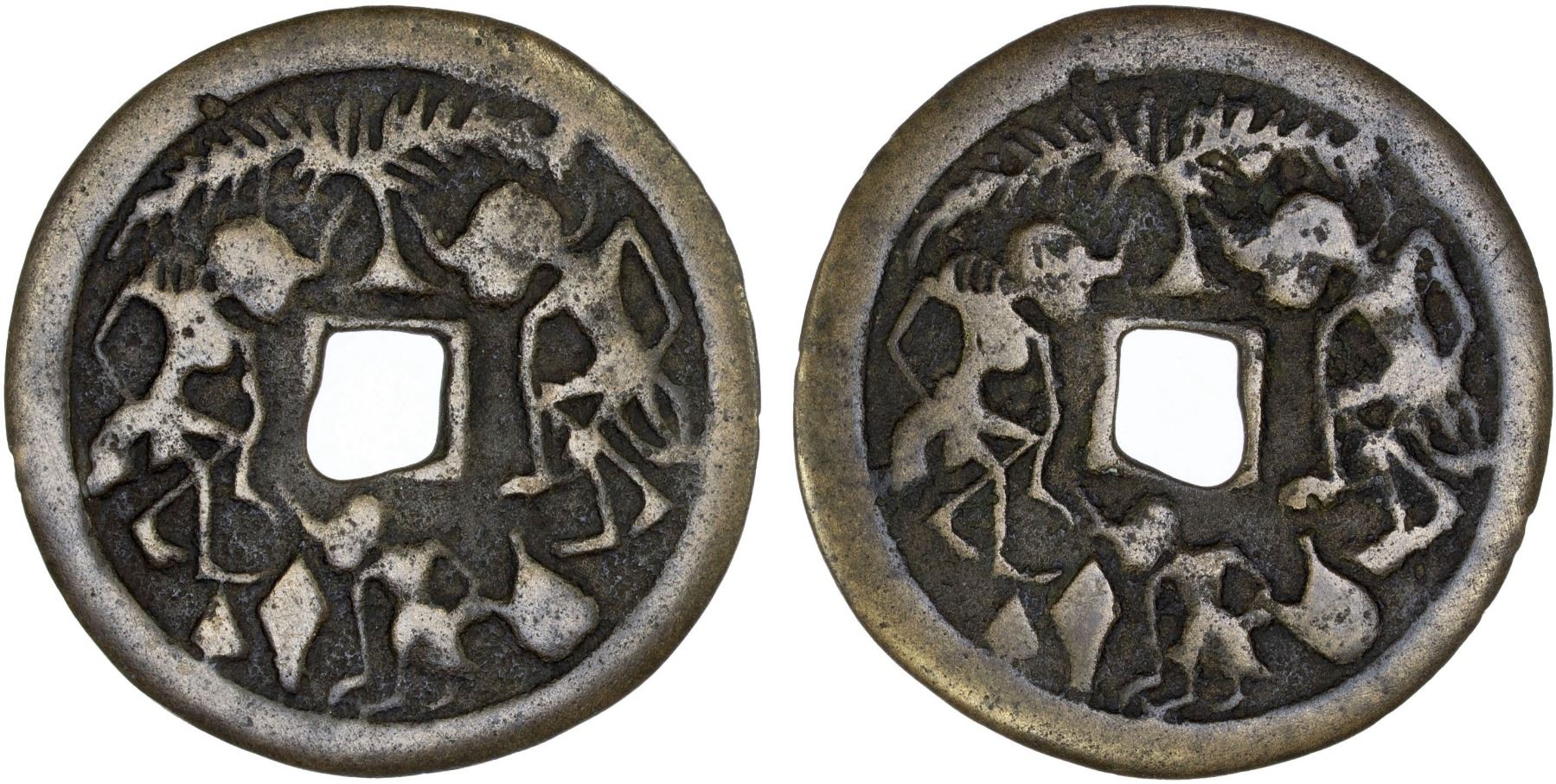 INDONESIA: JAVA: AE gobog (10.34g), Cribb-33, Millies-35, Series 1, Group 5, noble man and woman walking vis-à-vis, tree above, child between rice cone, rice kettle, and water pot below // same design, accompanied by collector tag, VF, ex Jürgen M. Wilmes Collection.