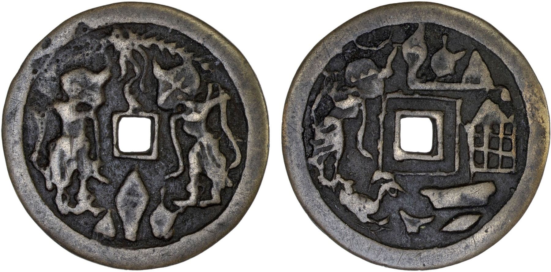 INDONESIA: JAVA: AE gobog (14.00g), Cribb-27, Millies-50, Series 1, Group 2, noble man and woman standing vis-à-vis, rice kettle between rice cone and water pot below // noble woman standing right, cage to right, crescent and shelf holding rice kettle, water pot, and rice cone above, chicken, bowl, rice trough, and leaf below, square frame around center hole, accompanied by collector tag, VF, ex Jürgen M. Wilmes Collection.