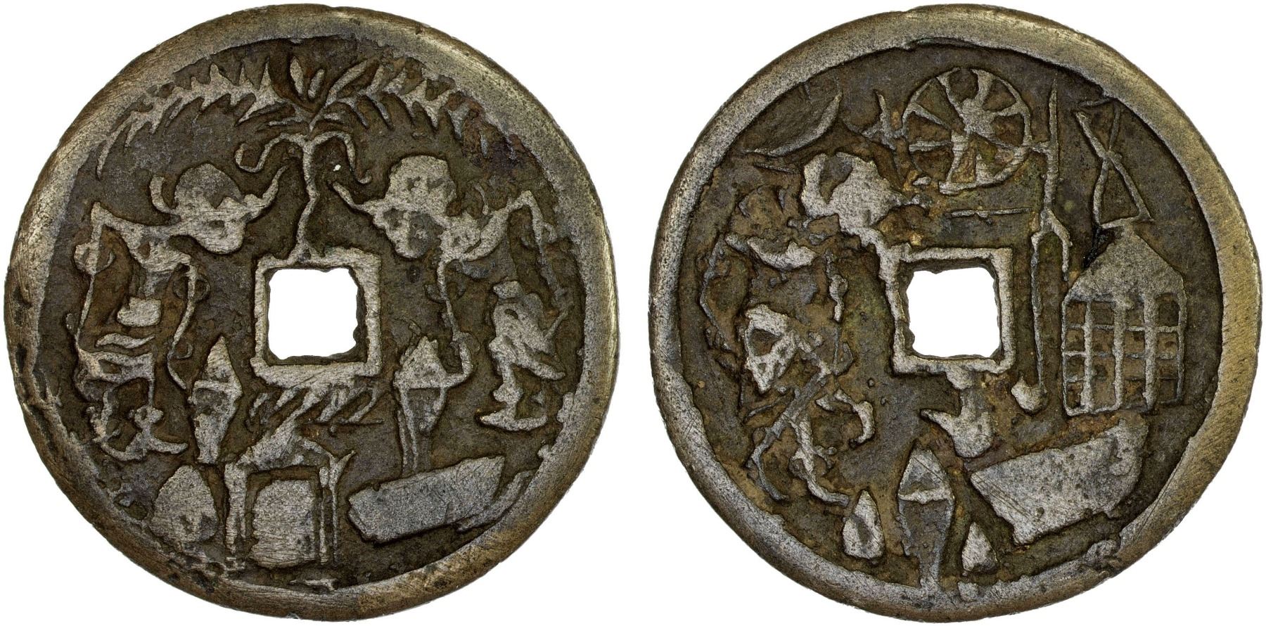 INDONESIA: JAVA: AE gobog (15.42g), Cribb-4, Millies-30, Series 1, Group 1, noble man and woman standing vis-à-vis, each holding rice kettle, tree above, rice barn between rice cone and rice trough below // noble woman walking right, cage and ladle to right, spinning wheel between crescent and thread winder above, rice kettle, rice cones, water pot, and rice trough below, accompanied by collector tag, Choice VF, ex Jürgen M. Wilmes Collection.