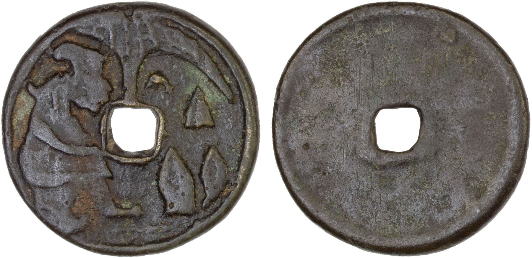 INDONESIA: JAVA: AE gobog (19.35g), Cribb-128, Series 4, Group 13, male servant standing right, facing rice cone, rice kettle, and leaf, tree and crescent above // blank, accompanied by collector tag, VF, ex Jürgen M. Wilmes Collection.