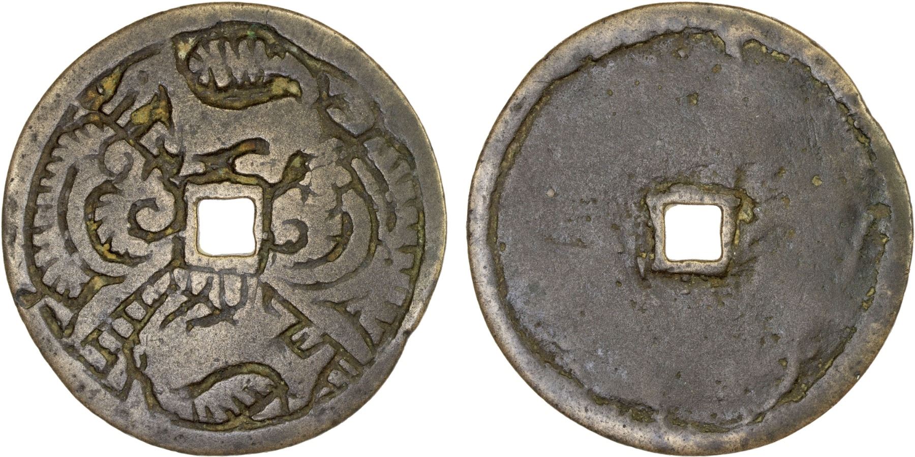 INDONESIA: JAVA: AE gobog (19.42g), Cribb-191a (plate example), 44mm, Series 10, Group 3, animal running above and below, floral scroll to left and right // blank, accompanied by collector tag, VF, ex Jürgen M. Wilmes Collection.