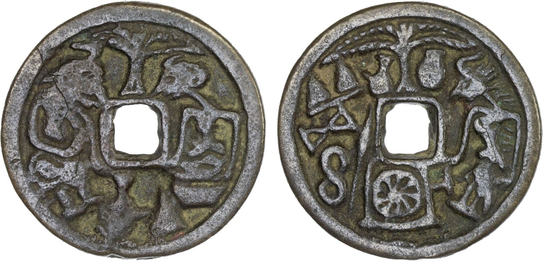 INDONESIA: JAVA: AE gobog (20.05g), Cribb-111, Millies-37, Series 4, Group 3, male servant standing vis-à-vis with seated noble man, tree above, water pot and rice cone below // noble woman standing left, facing rice cones on a tray, thread winder, twist of thread, and spindle, tree between water pot and jar above, spinning wheel below, casting crack, accompanied by collector tag, Choice VF, ex Jürgen M. Wilmes Collection.