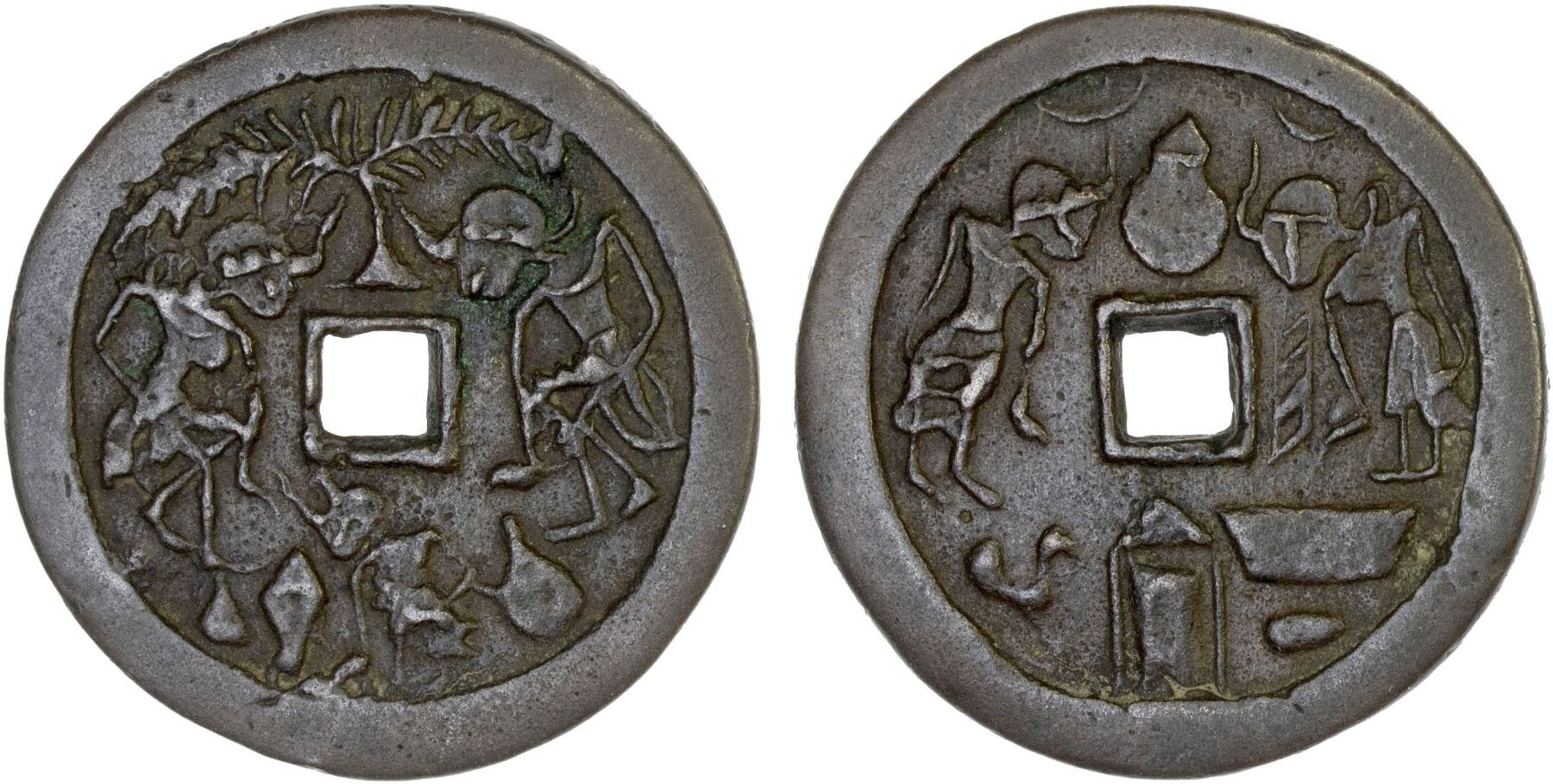 INDONESIA: JAVA: AE gobog (21.66g), Cribb-32, Millies-45, Series 1, Group 5, noble man and woman walking vis-à-vis, tree above, child between rice cone, rice kettle, and water pot below // noble man and woman standing vis-à-vis, jar and crescents above, rice barn between chicken and rice trough below, a well-cast example with attractive patina, accompanied by collector tag, XF, ex Jürgen M. Wilmes Collection.