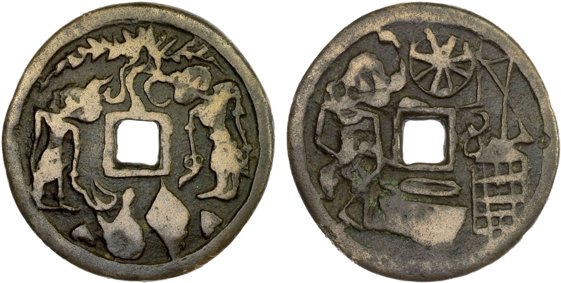 INDONESIA: JAVA: AE gobog (23.84g), Cribb-7j (plate example), Millies-29, Series 1, Group 1, noble man and woman standing vis-à-vis, tree above, water pot and rice kettle between rice cones below // noble woman walking right, cage to right, spinning wheel between crescent and thread winder above, rice trough below, accompanied by collector tag, F-VF, ex Jürgen M. Wilmes Collection.