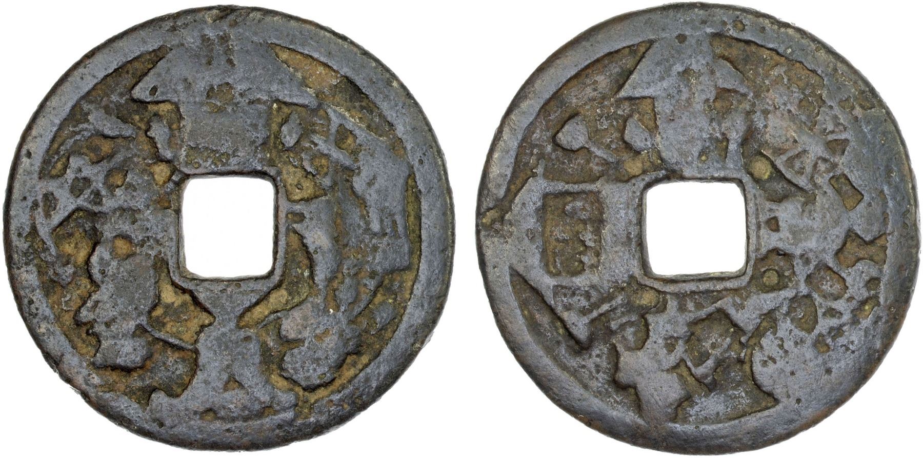 INDONESIA: JAVA: AE gobog (24.34g), Cribb-102, Millies-63, Series 3, Group 8, noble woman holding rice kettle and male servant holding stick standing vis-à-vis, with offering stand, thread winder, and star below their feet, tree with crescent above, rice barn between rice kettles below // clockwise from the top: male servant standing facing, holding an object in each hand, with thread winder to his left / noble woman seated right with spinning wheel / shrine with rice cones between water pots / rice barn between rice kettles, accompanied by collector tag, Fine, ex Jürgen M. Wilmes Collection.