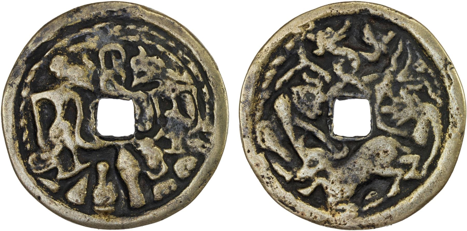 INDONESIA: JAVA: AE gobog (25.88g), Cribb-104, Series 4, Group 1, noble man and woman standing vis-à-vis, tree above, rice cone, water pot, rice kettle, and child below // two male servants standing vis-à-vis, one holding water buffalo below by its horn, the other holding keris aloft, entwined serpents above, somewhat crude casting style, accompanied by collector tag, VF, ex Jürgen M. Wilmes Collection.