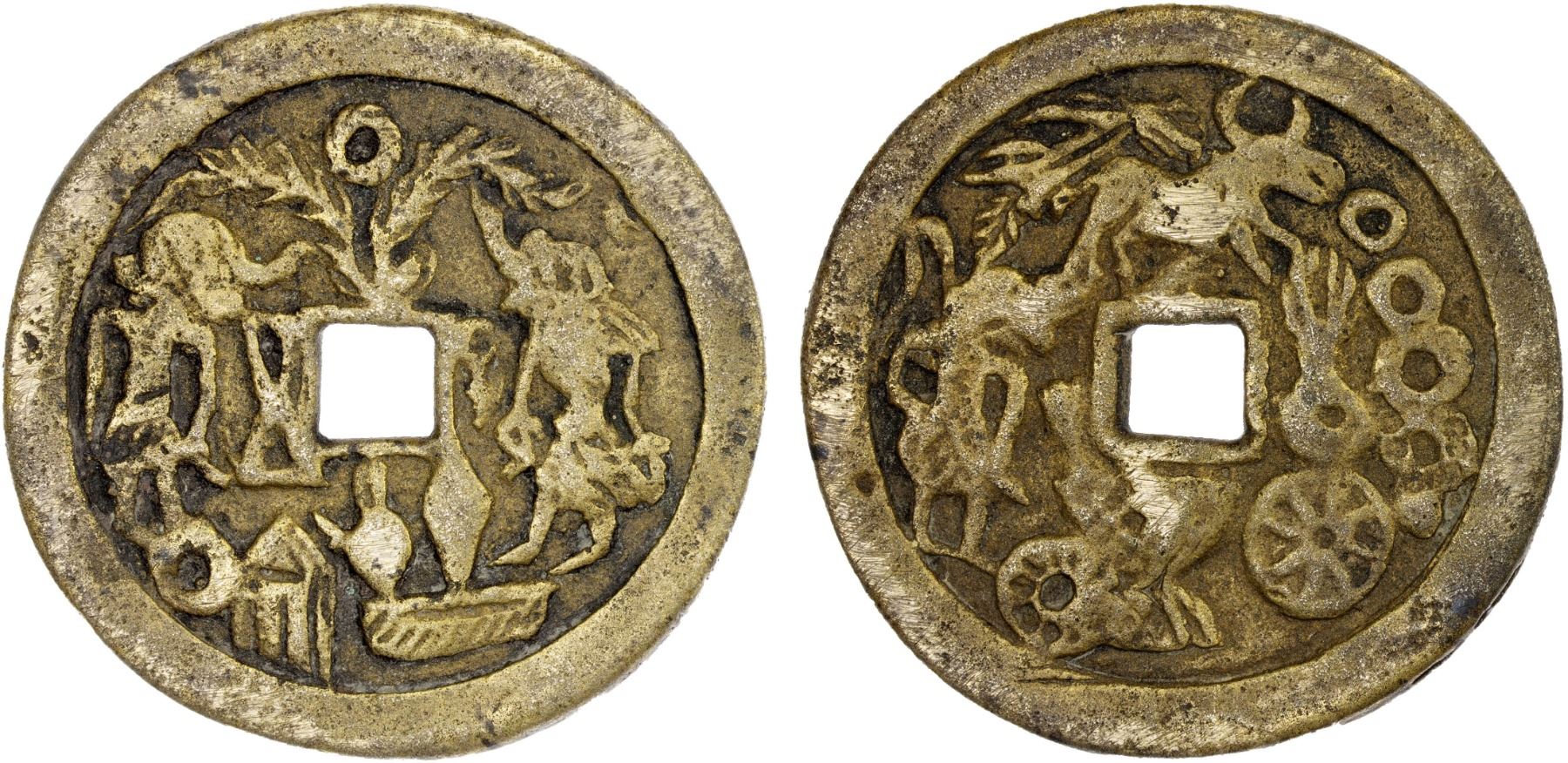 INDONESIA: JAVA: AE gobog (26.33g), Cribb-41, Millies-75, 46mm, Series 1, Group 6, noble man with thread winder and noble woman standing vis-à-vis, tree with ring above, coin, rice barn, water pot, rice kettle, and rice trough below // noble man with whip standing right, loop of thread and rings to right, water buffalo above, basket between wheels below, light porosity, some scrapes on reverse, accompanied by collector tag, VF, ex Jürgen M. Wilmes Collection.