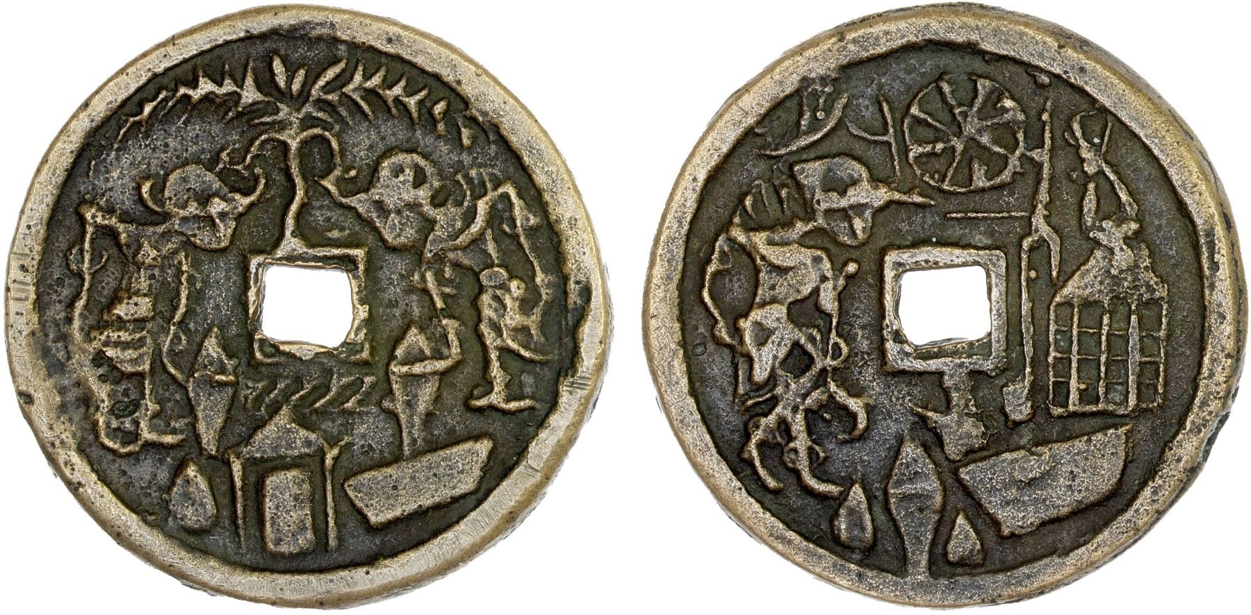 INDONESIA: JAVA: AE gobog (27.98g), Cribb-4, Millies-30, Series 1, Group 1, male and female figures standing vis-à-vis, each holding rice kettle, tree above, rice barn between rice cone and rice trough below // female figure walking right, cage and ladle to right, spinning wheel between crescent and thread winder above, rice kettle, rice cones, water pot, and rice trough below, a rather heavy example, accompanied by collector tag, XF, ex Jürgen M. Wilmes Collection.
