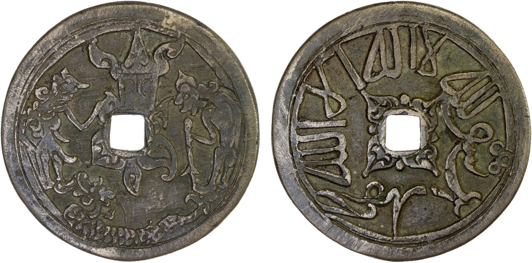 INDONESIA: JAVA: AE gobog (53.45g), Cribb-211a (plate example), 68mm, noble man and male servant with staff standing vis-à-vis, shrine above, serpent below // kalima in Arabic script, floral ornaments around hole on both side, a beautiful and very rare example illustrating the various cultural influences on Java, accompanied by collector tag, XF, ex Jürgen M. Wilmes Collection.