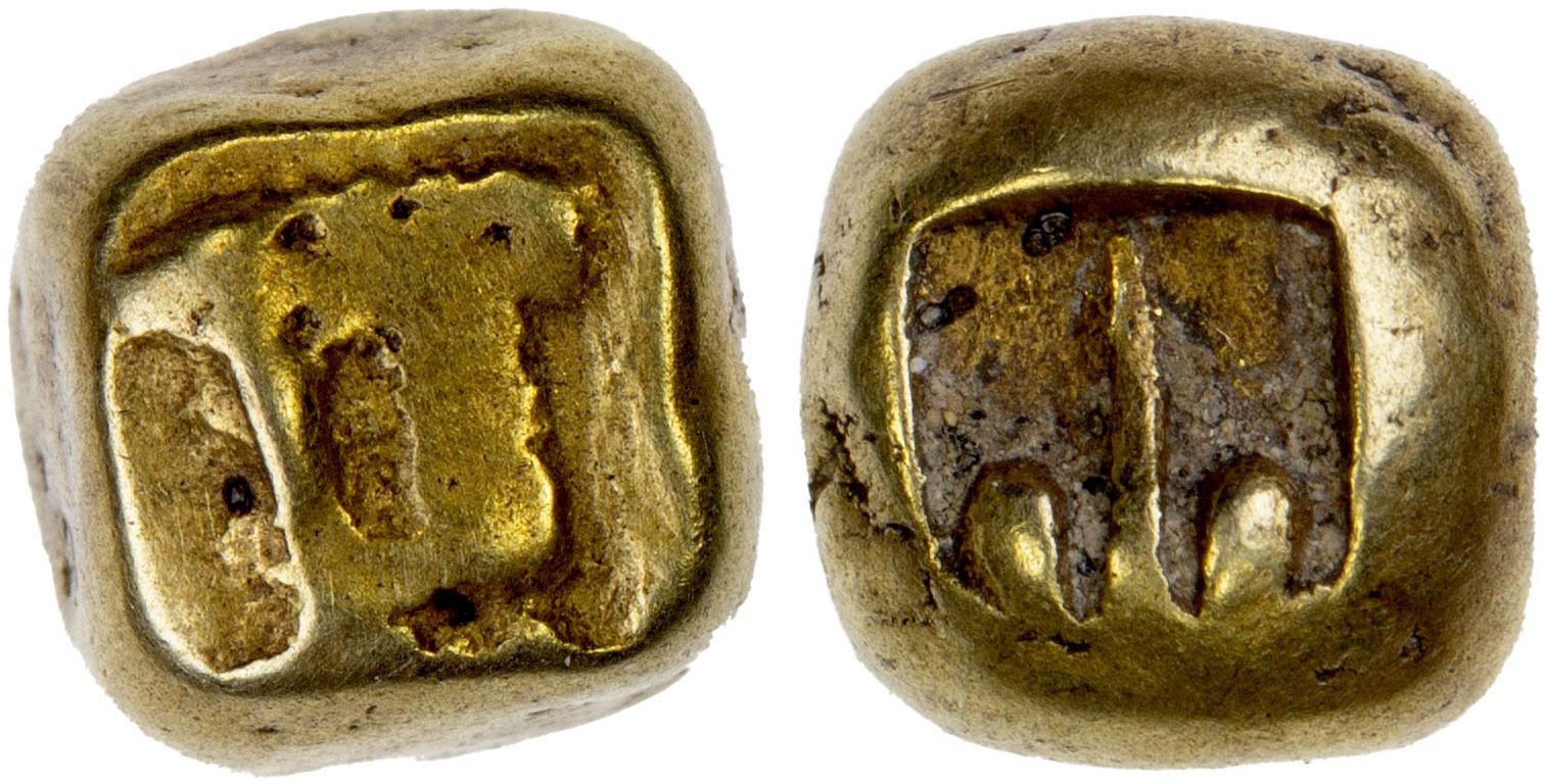 INDONESIA: JAVA: Kingdom of Sailendra, AV massa (2.45g), ca. 800-950, Mitchiner SEA-722, Millies-1-3, cubic ingot with Devanagari Ta on obverse and lingam on reverse, VF-XF, ex Jürgen M. Wilmes Collection.