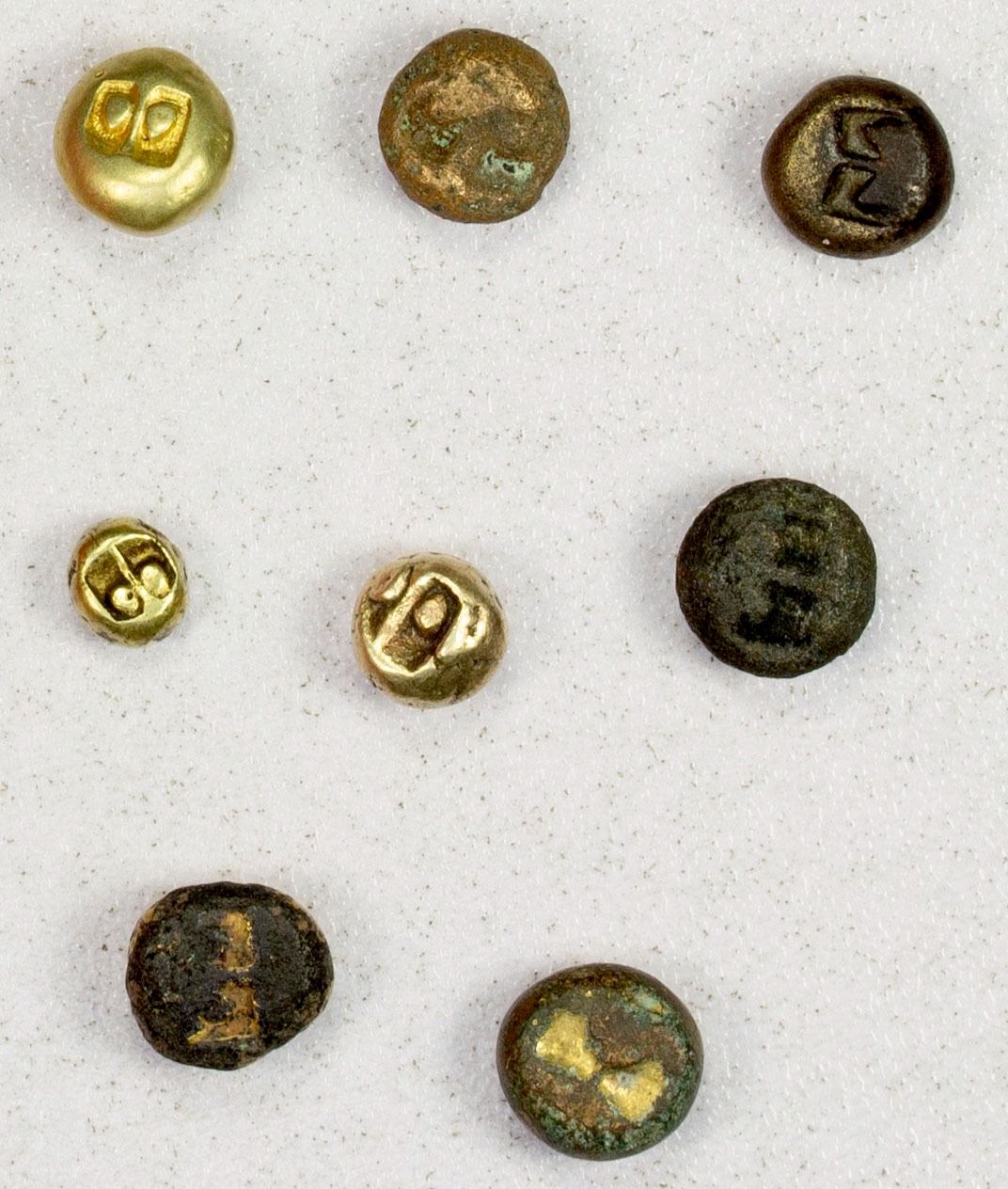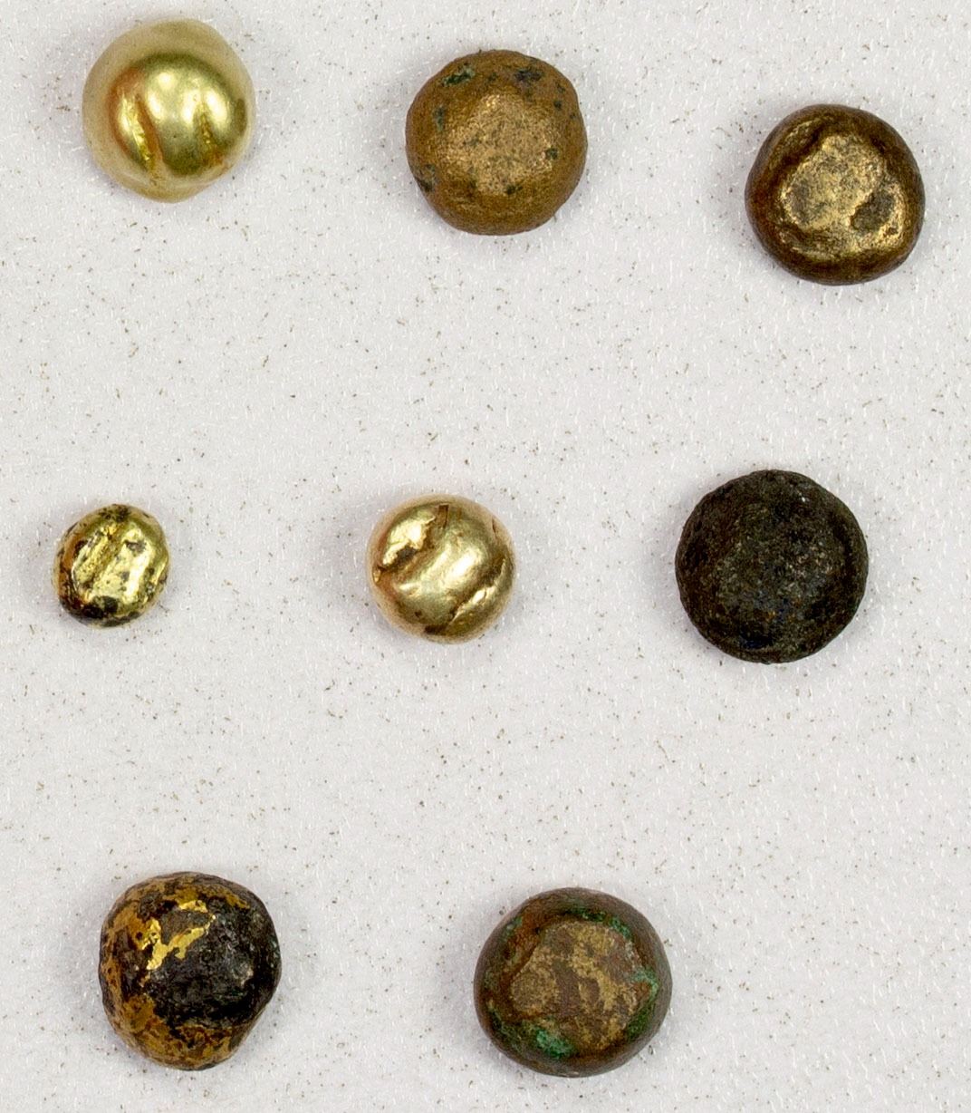 JAVA: Kingdom of Sailendra, LOT of 8 coins (3 gold), including an AV mas (2.35g, 20 ratti, Mitch SEA-726-28), an AV atak (1.17g, 10 ratti, Mitch SEA-729), and an AV 1/2 atak (0.61g, 5 ratti, Mitch SEA-), and 5 contemporary gilt forgeries of the mas; retail value $350, lot of 8 pieces, ex Jürgen M. Wilmes Collection.