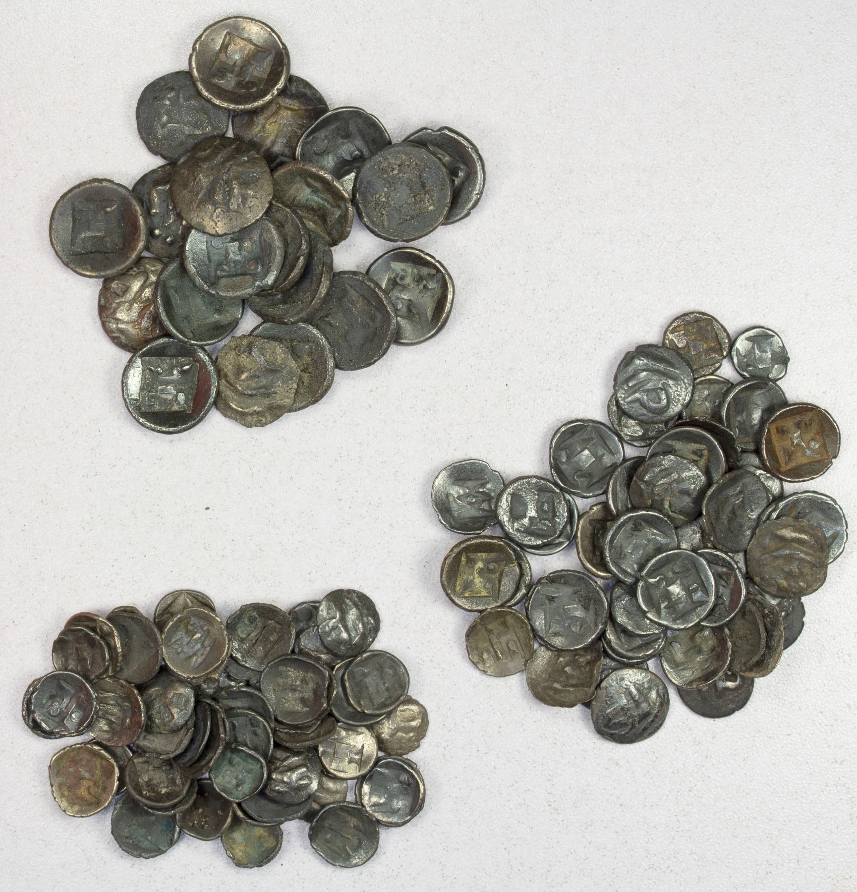 JAVA: LOT of about 110 AR units, all sandalwood flower-type but the variety with a thinner, more scyphate flan, with 20 standard units (ca. 2-2.4g), about 40 half units (ca. 0.8-1.2g), and about 50 quarter units (ca. 0.4-0.5g); all in reasonably fine silver; most Fine or VF, some quarter units with light chipping; retail value $400, lot of about 110 pieces, ex Jürgen M. Wilmes Collection.