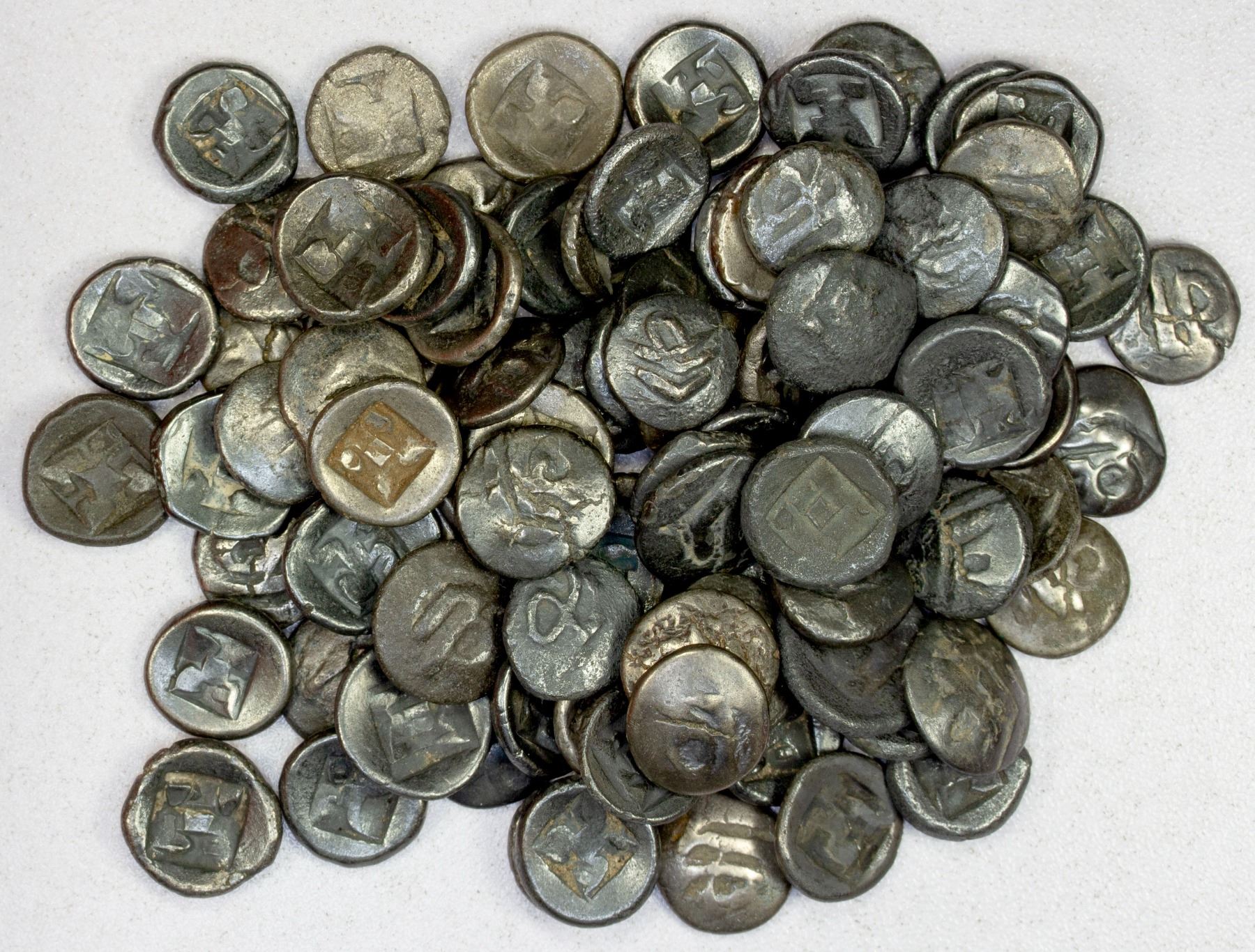 JAVA: LOT of about 90 AR units, all the sandalwood flower-type, attributed by some to the Majapahit Empire, most ca. 2-2.4g and in reasonably fine silver; most Fine or VF, some with clear bold lettering; retail value $550, lot of about 90 pieces, ex Jürgen M. Wilmes Collection.