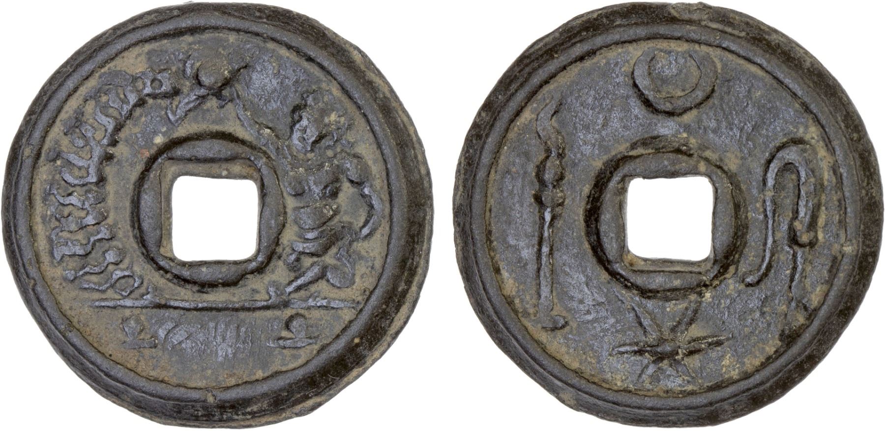 INDONESIA: JAVA: tin charm (3.43g), Millies-109var, cf. Zeno-286952, figure seated left on raised platform, pouring water from conch shell // clockwise from the top: crescent, fly whisk, 6-rayed star, torch, VF-XF, ex Jürgen M. Wilmes Collection.