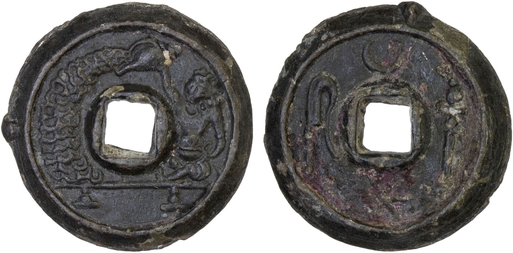 JAVA: tin charm (3.61g), Millies-109var, cf. Zeno-286952, figure seated left on raised platform, pouring water from conch shell // clockwise from the top: crescent, torch, 6-rayed star, fly whisk, some scratches on reverse, VF-XF, ex Jürgen M. Wilmes Collection.