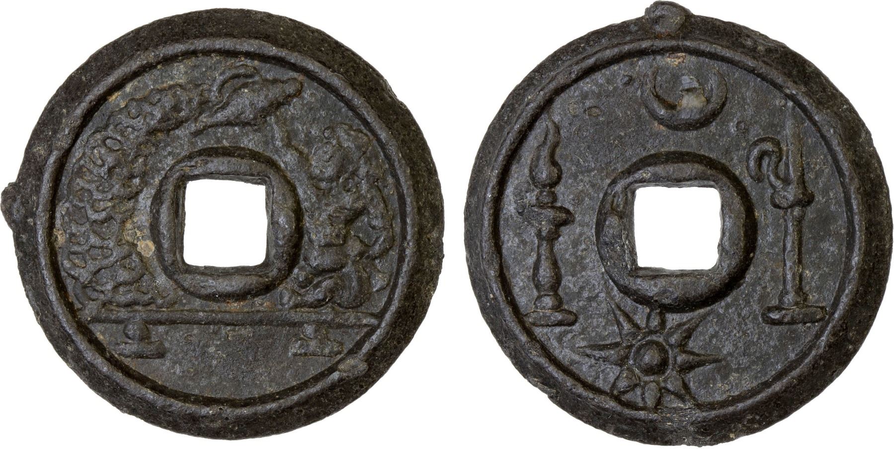 JAVA: tin charm (4.05g), Millies-109var, cf. Zeno-286952, figure seated left on raised platform, pouring water from conch shell // clockwise from the top: crescent, goad, 8-rayed star, torch, XF, ex Jürgen M. Wilmes Collection.