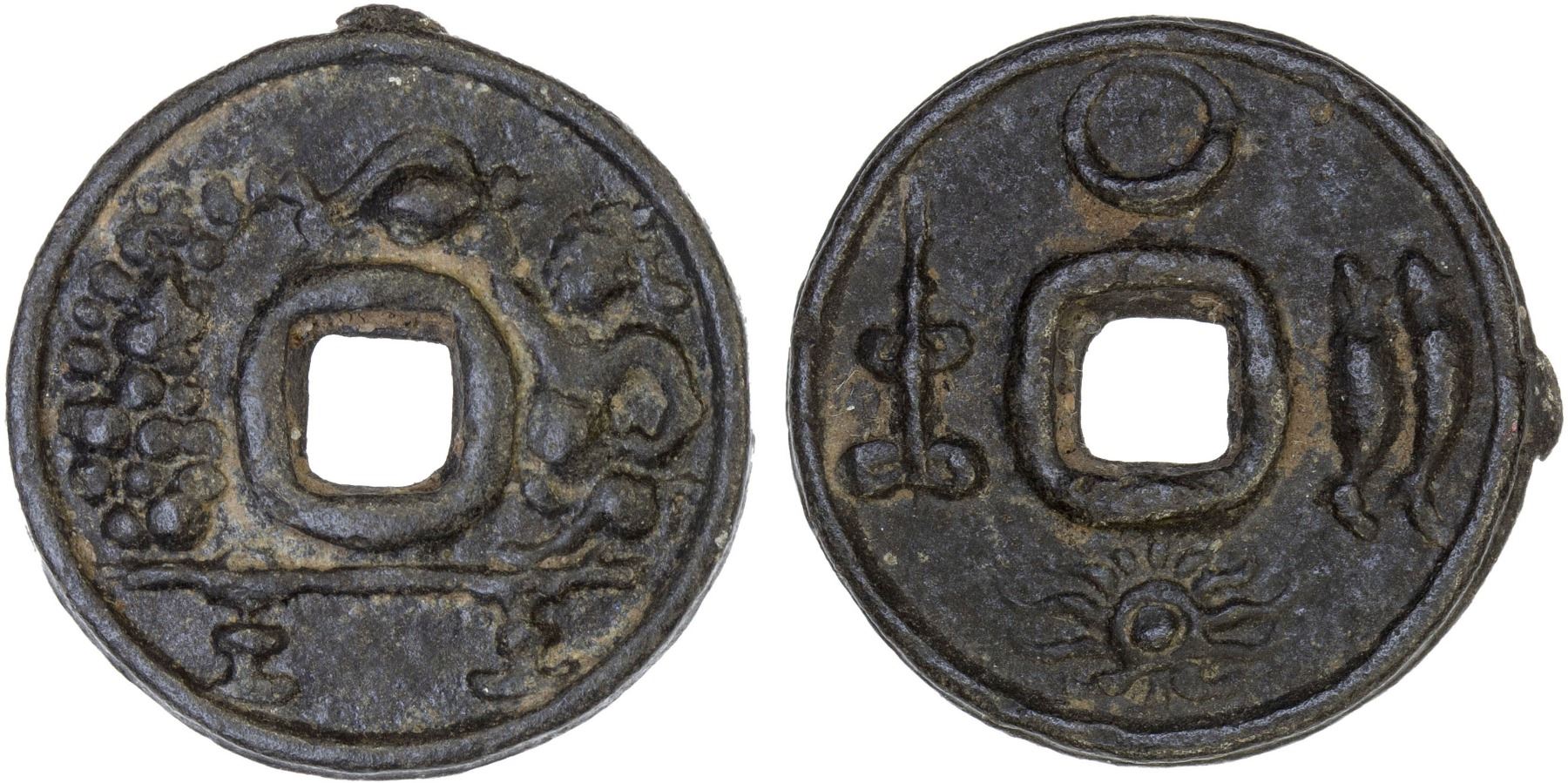JAVA: tin charm (4.15g), Millies-109var, cf. Zeno-286952, figure seated left on raised platform, pouring water from conch shell // clockwise from the top: annulet, two fish, sun, srivatsa(?), Choice VF, ex Jürgen M. Wilmes Collection.
