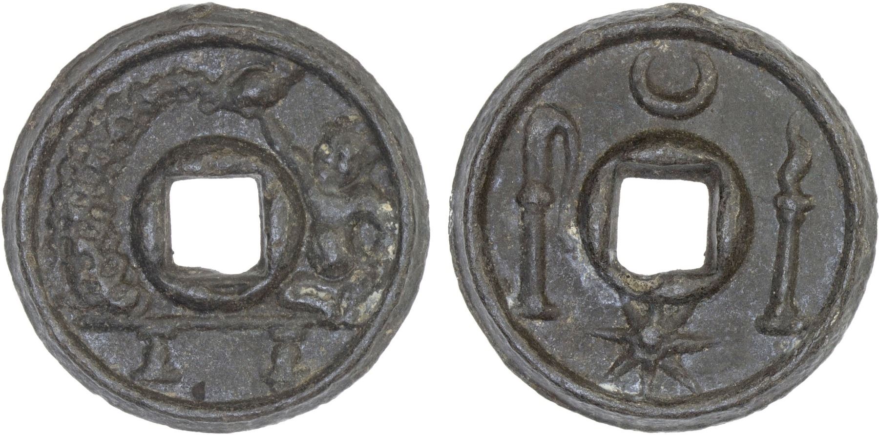 INDONESIA: JAVA: tin charm (4.16g), Millies-109var, cf. Zeno-286952, figure seated left on raised platform, pouring water from conch shell // clockwise from the top: crescent, torch, 8-rayed star, fly whisk, some scratches on reverse, VF-XF, ex Jürgen M. Wilmes Collection.
