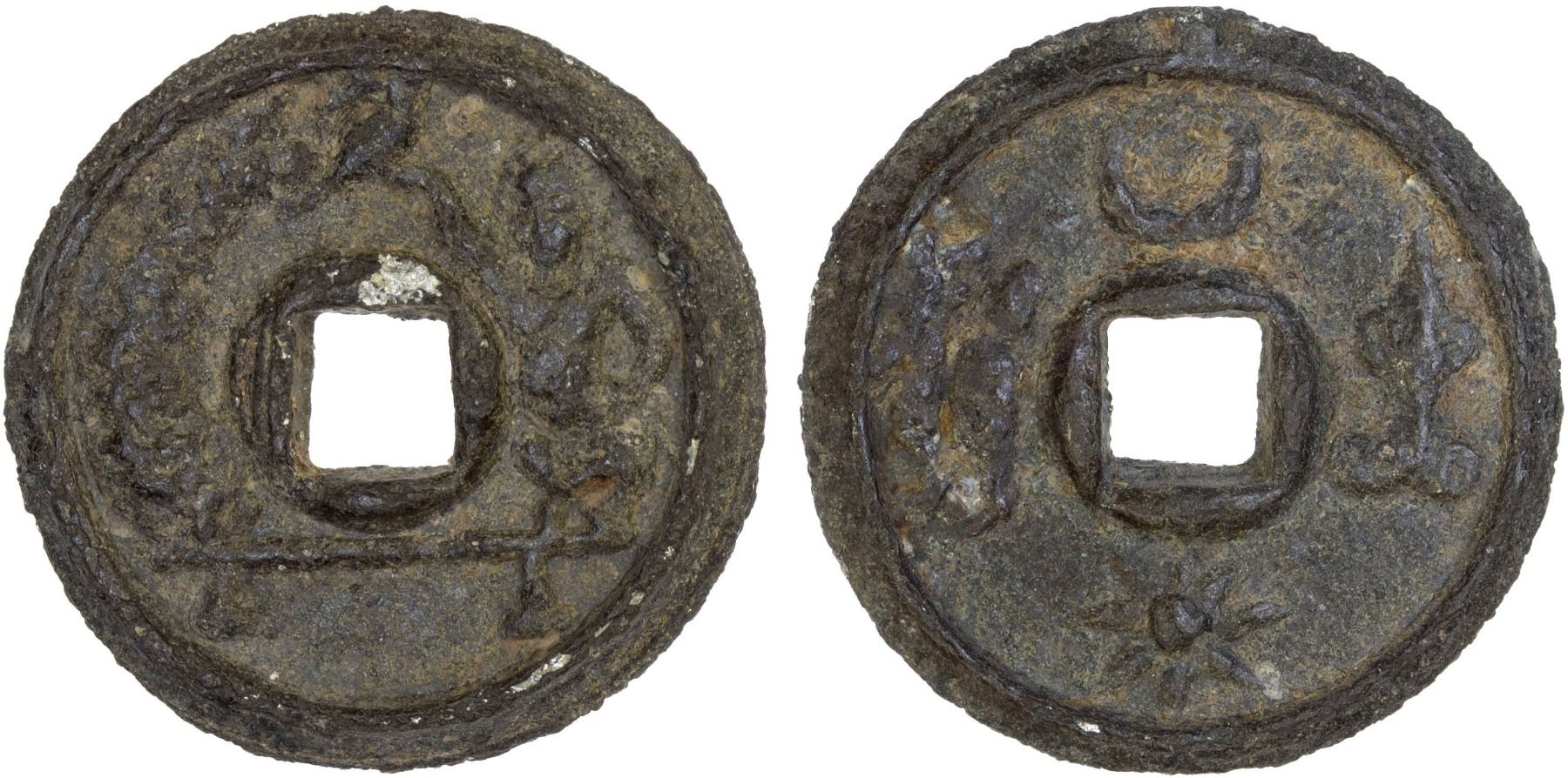 INDONESIA: JAVA: tin charm (4.19g), Millies-109var, cf. Zeno-286952, figure seated left on raised platform, pouring water from conch shell // clockwise from the top: crescent, srivatsa(?), 8-rayed star, two fish, VF, ex Jürgen M. Wilmes Collection.