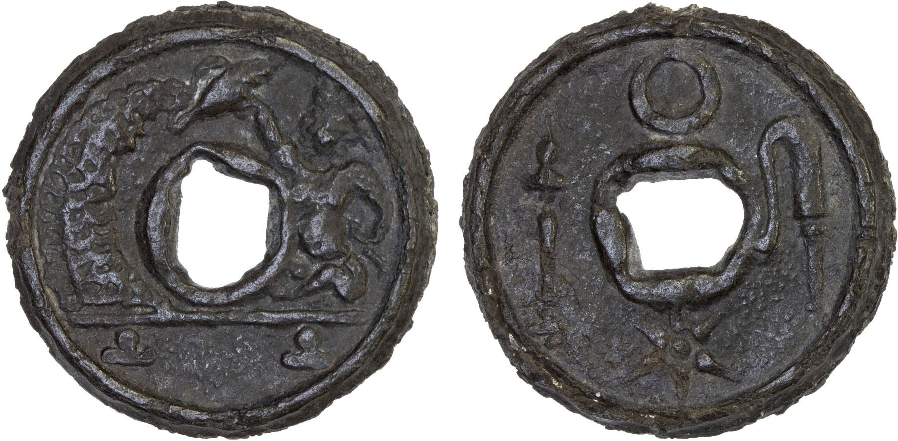 JAVA: tin charm (4.27g), Millies-109var, cf. Zeno-286952, figure seated left on raised platform, pouring water from conch shell // clockwise from the top: annulet, fly whisk, 6-rayed star, torch, Choice VF, ex Jürgen M. Wilmes Collection.