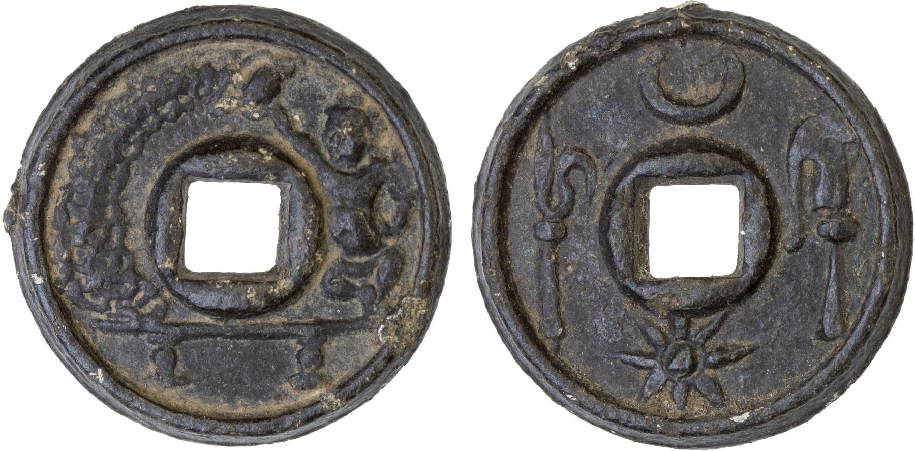 JAVA: tin charm (4.33g), Millies-109var, cf. Zeno-286952, figure seated left on raised platform, pouring water from conch shell // clockwise from the top: crescent, fly whisk, 8-rayed star, goad, Choice VF, ex Jürgen M. Wilmes Collection.