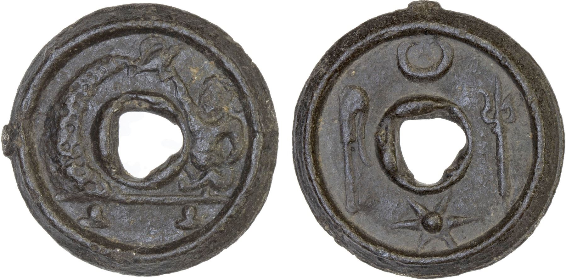 JAVA: tin charm (5.18g), Millies-109var, cf. Zeno-286952, figure seated left on raised platform, pouring water from conch shell // clockwise from the top: crescent, trident, 6-rayed star, fly whisk, VF-XF, ex Jürgen M. Wilmes Collection.