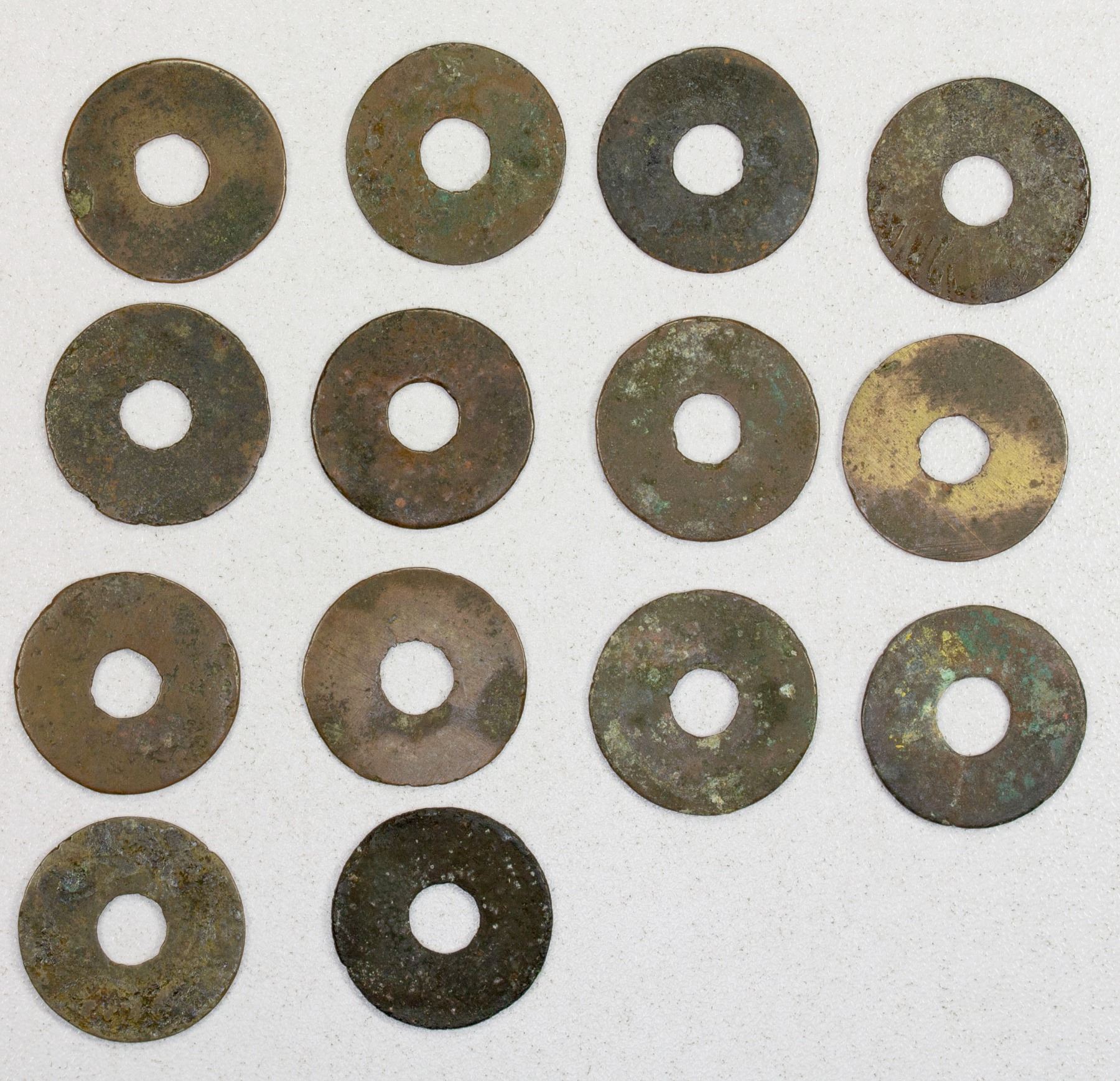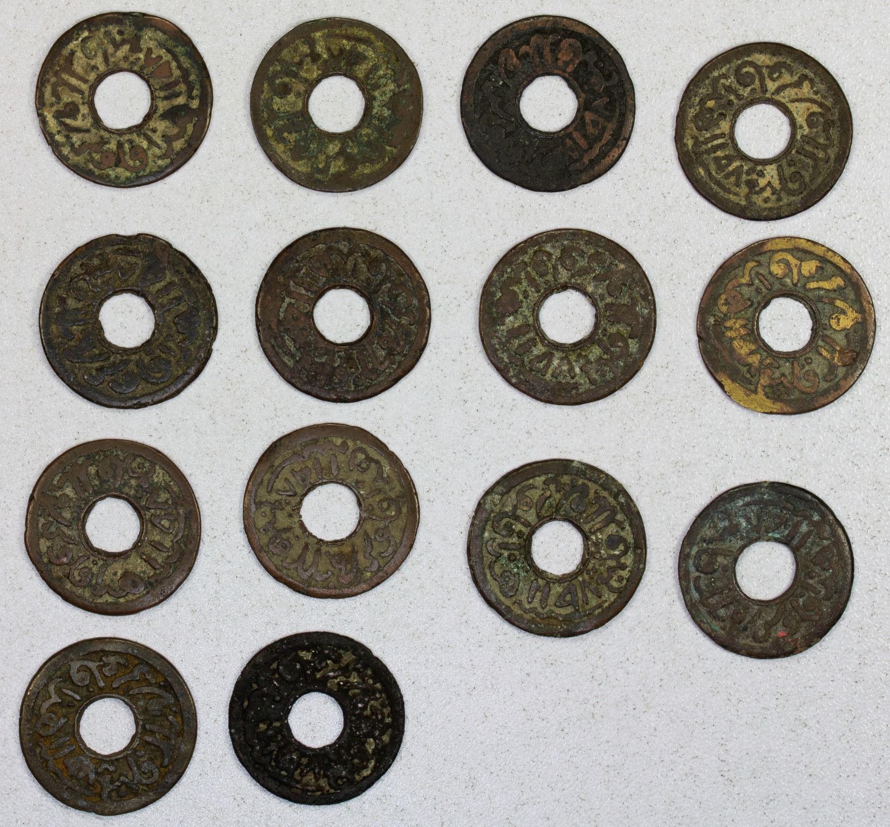 PALEMBANG: LOT of 14 AE cash coins, all Millies-188 (cf. Zeno-1542), dated AH1198, issued during the reign of Mahmud Badaruddin; most with decent surfaces, a few with quite attractive brown patina; retail value $400, lot of 14 pieces, ex Jürgen M. Wilmes Collection.