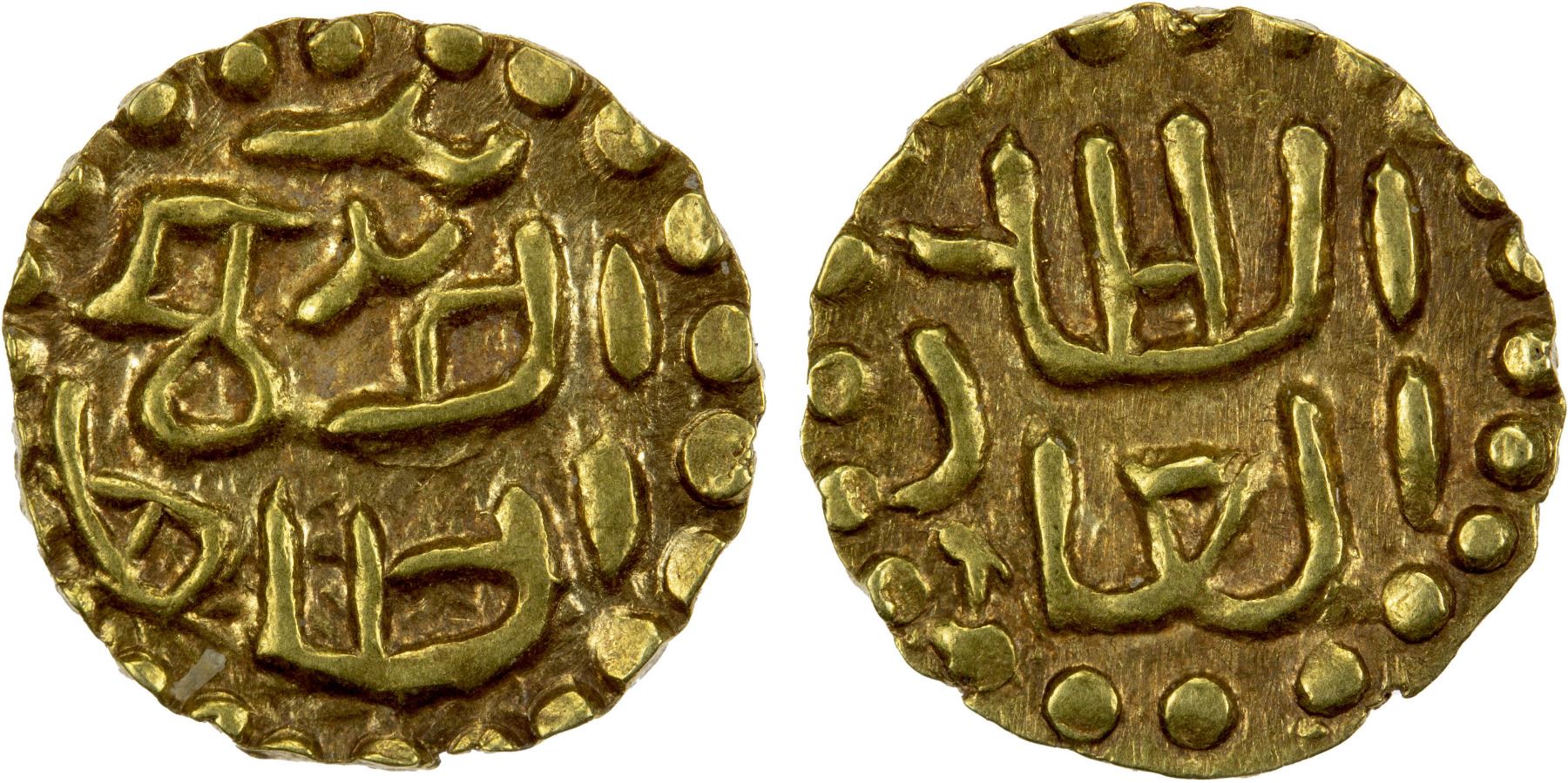 INDONESIA: SAMUDRA-PASAI: Abu'l-Din, ca. 1405-1412, AV mas (0.59g), Leyten-SP13a, abu al-din malik / al-tahir // al-sultan al-`adil, fields with much luster, AU. After Sultan Zain al-`Abidin II was killed in a war against Nakur, his widow, `Abbadta Malikah Shah, promised her hand and the throne to anyone who would avenge his death. An old fisherman would later kill the king of Nakur and thus marry the queen and become the new sultan, whereupon he took the honorific title of Abu'l-Din ("Father of the faith").