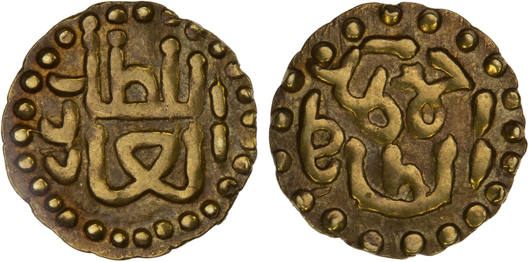 INDONESIA: SAMUDRA-PASAI: Ahmad II or III, 1326-1360 or 1435-1452, AV kupang (0.62g), Leyten-SP6a, ahmad malik al-tahir // al-sultan al-'adil, VF-XF, ex Jürgen M. Wilmes Collection. Leyten states it is impossible to distinguish between the coinages of Ahmad II (1326-1360) and Ahmad III (1435-1452).