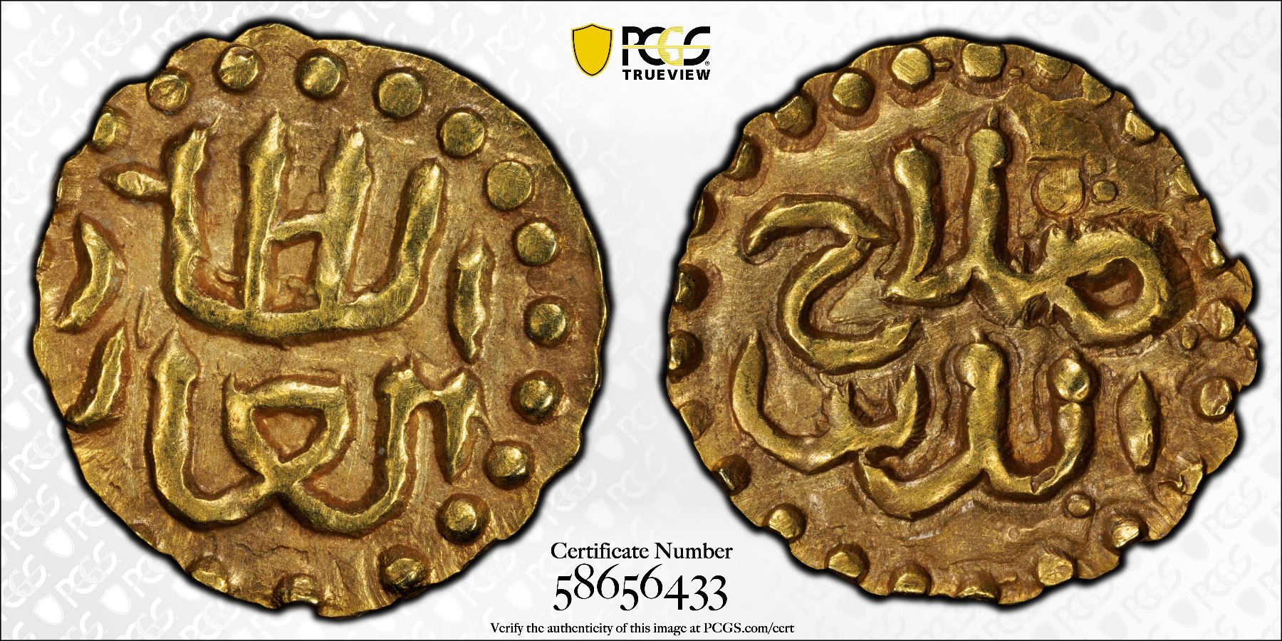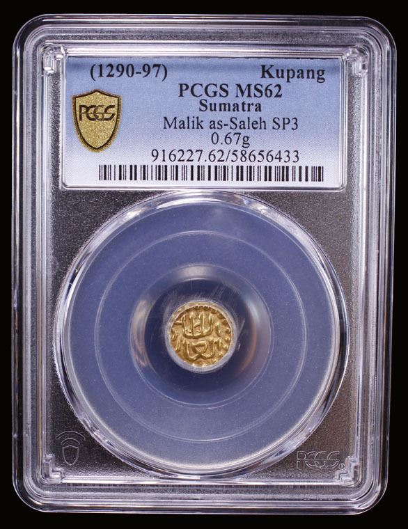 SAMUDRA-PASAI: Malik as-Salih (Malikussaleh), ca. 1290-1297, AV kupang (0.67g), Leyten-SP3, Jawi legend salih / al-din // al-sultan al-`adil, PCGS graded MS62. Malik as-Salih (Malikussaleh) was the founder of the Kingdom of Samudra-Pasai. Originally named Mara Silu (or Merah Silu), he renamed himself after the contemporary Ayyubid ruler after converting to Islam.