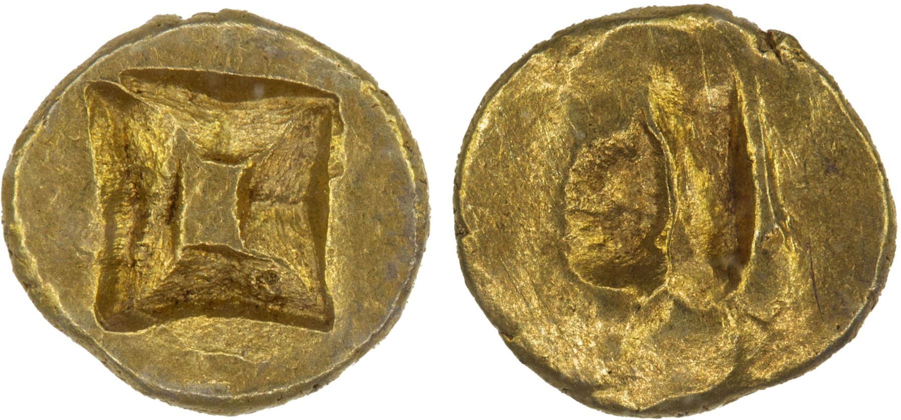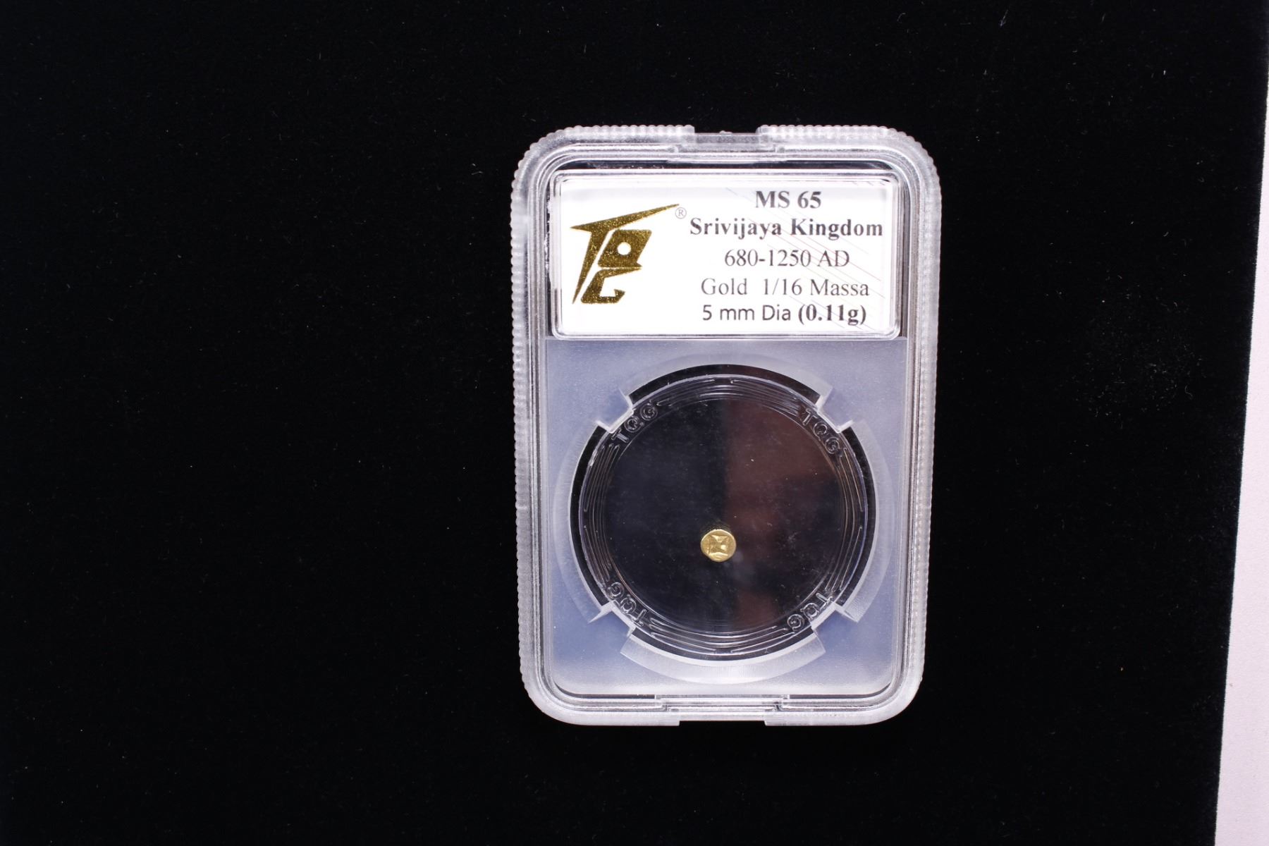 SRIVIJAYA: AV 1/16 massa (0.11g), ca. 11th-13th century, cf. Mitch-SEA-717 (1/8 massa), sandalwood flower pattern within incuse square // Devanagari letter ma, lovely luster, TQG graded MS65.