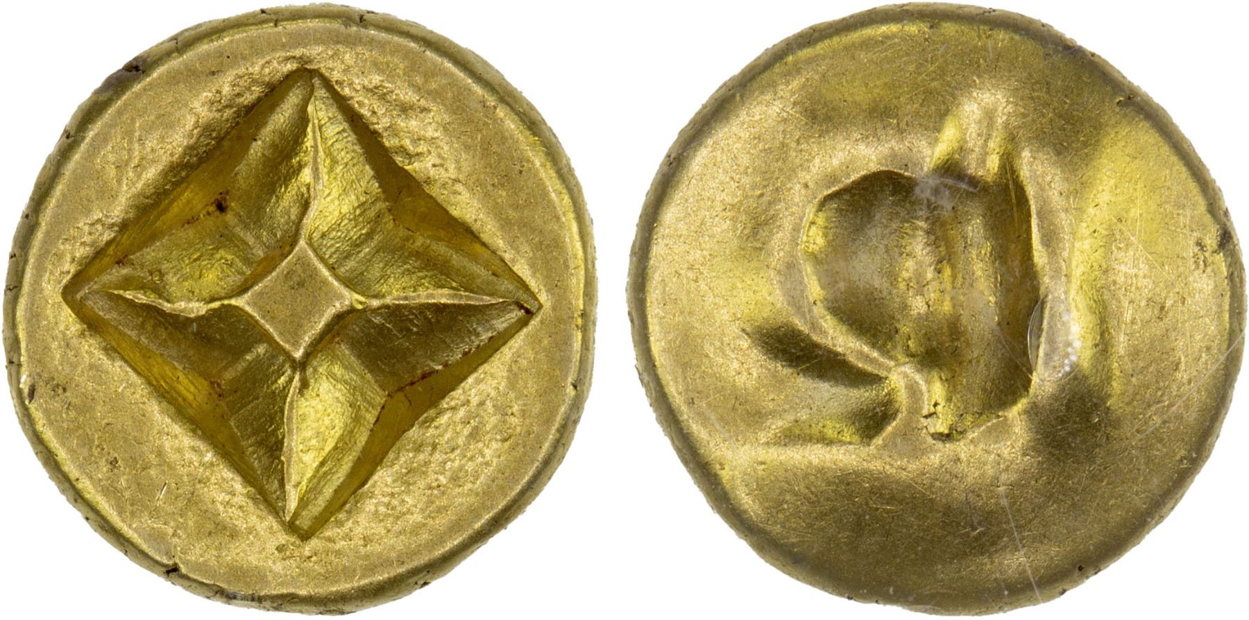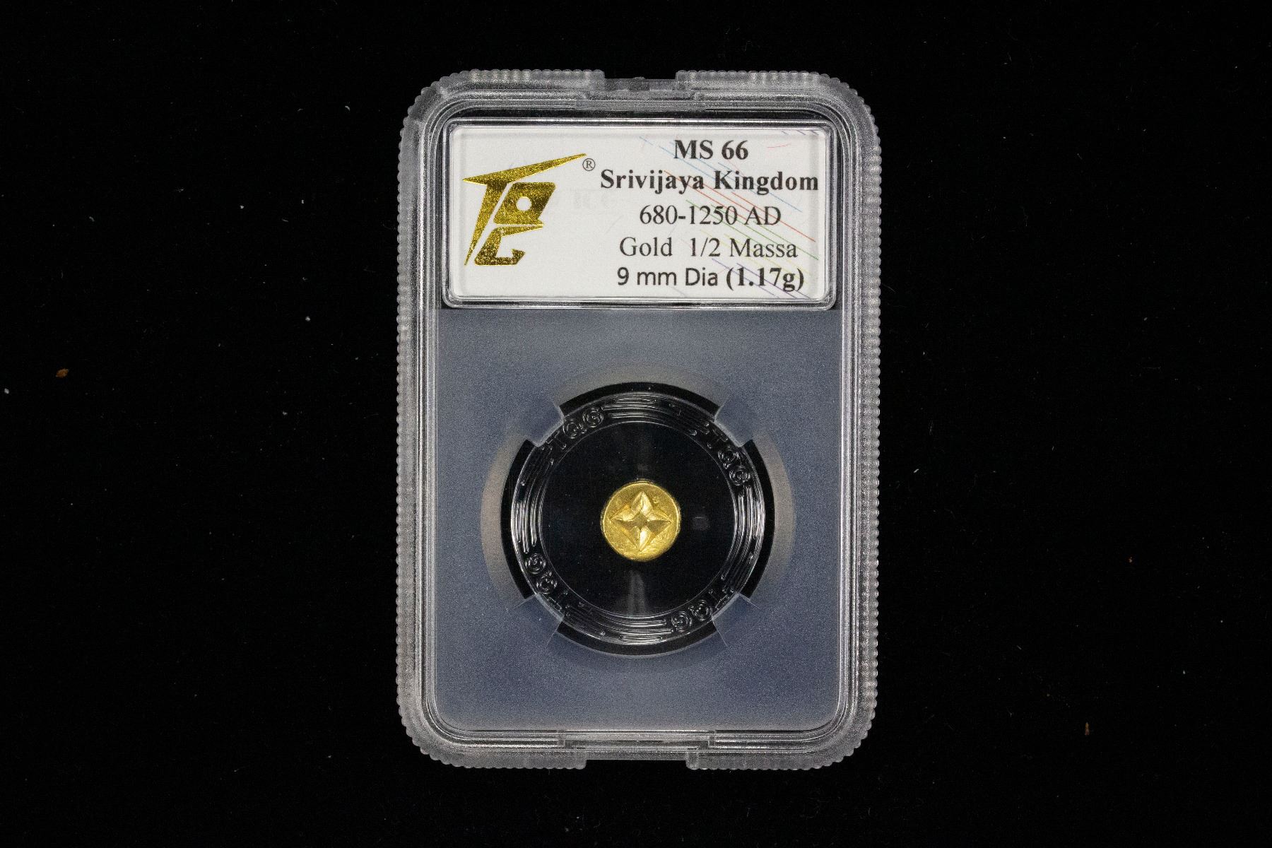 SRIVIJAYA: AV 1/2 massa (1.17g), ca. 11th-13th century, Millies-128-131, sandalwood flower pattern within incuse square // Devanagari letter ma, attractive luster, TQG graded MS66.