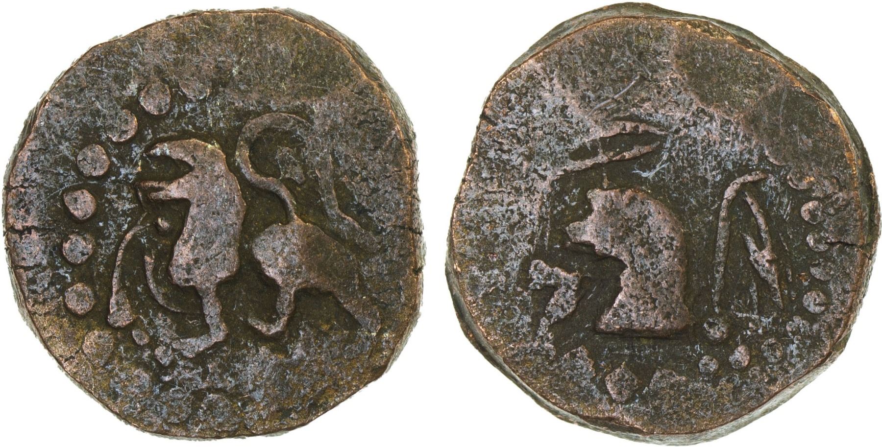 SRIVIJAYA: Anonymous, ca. 11th-14th century, AE unit (7.03g), cf. Zeno-310220, lion walking left, one paw holding sword // head of lion left, umbrella above, uncertain symbol to left, fly whisk to right, VF. This coin is an example of a recently discovered type from central Sumatra called Jambi lion coins. Very little is known about its historical background. See Zeno-310216 for a discussion on this type.