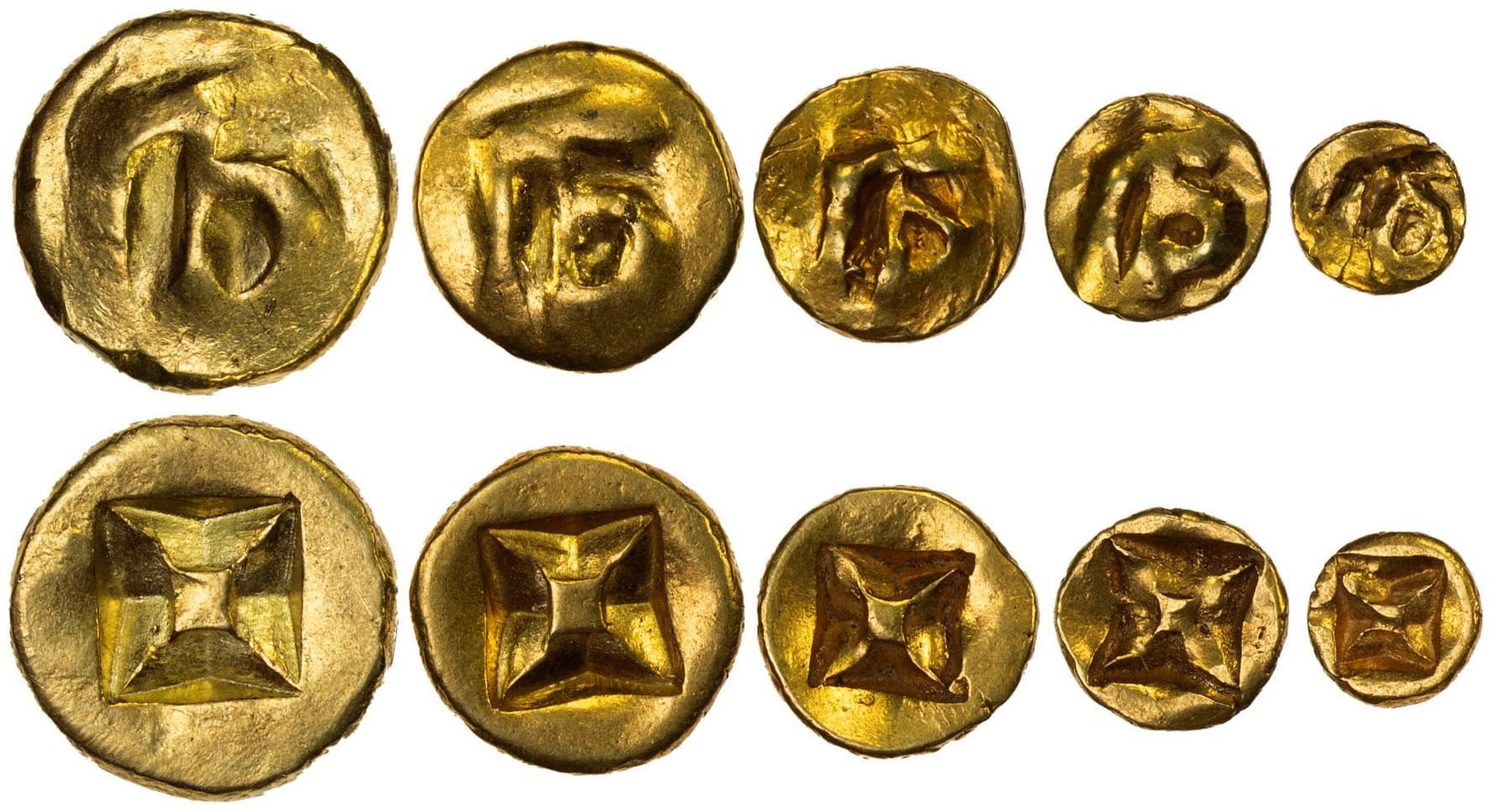 SRIVIJAYA: SET of 5 gold coins, ca. 11th-13th century, cf. Mitch SEA-715-17, all with sandalwood flower pattern on one side, and Devanagari letter ma on the other, weighing 2.23g, 1.20g, 0.56g, 0.28g, and 0.16g respectively, all in VF, lightly cleaned; set of 5 coins.