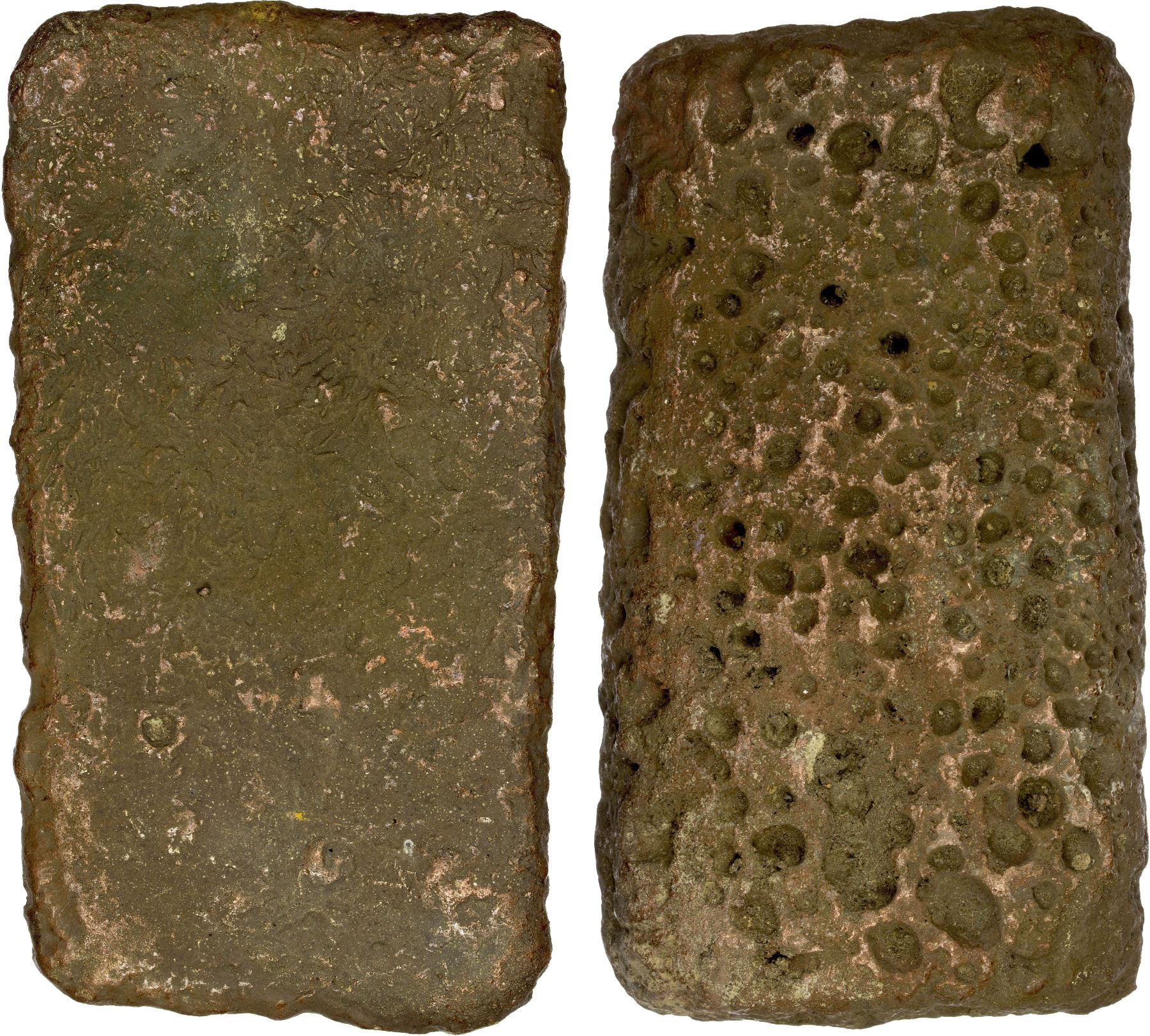 SRIVIJAYA: copper ingot (1504g), 11th-13th century, ca. 160 x 85 x 17mm, with honeycomb patterns on one side and flat surface on the other, VF. Similar copper ingots were found in a sunken vessel in the Batang Hari River on Sumatra alongside a hoard of Song cash coins. This find suggests a monetary purpose for these ingots.