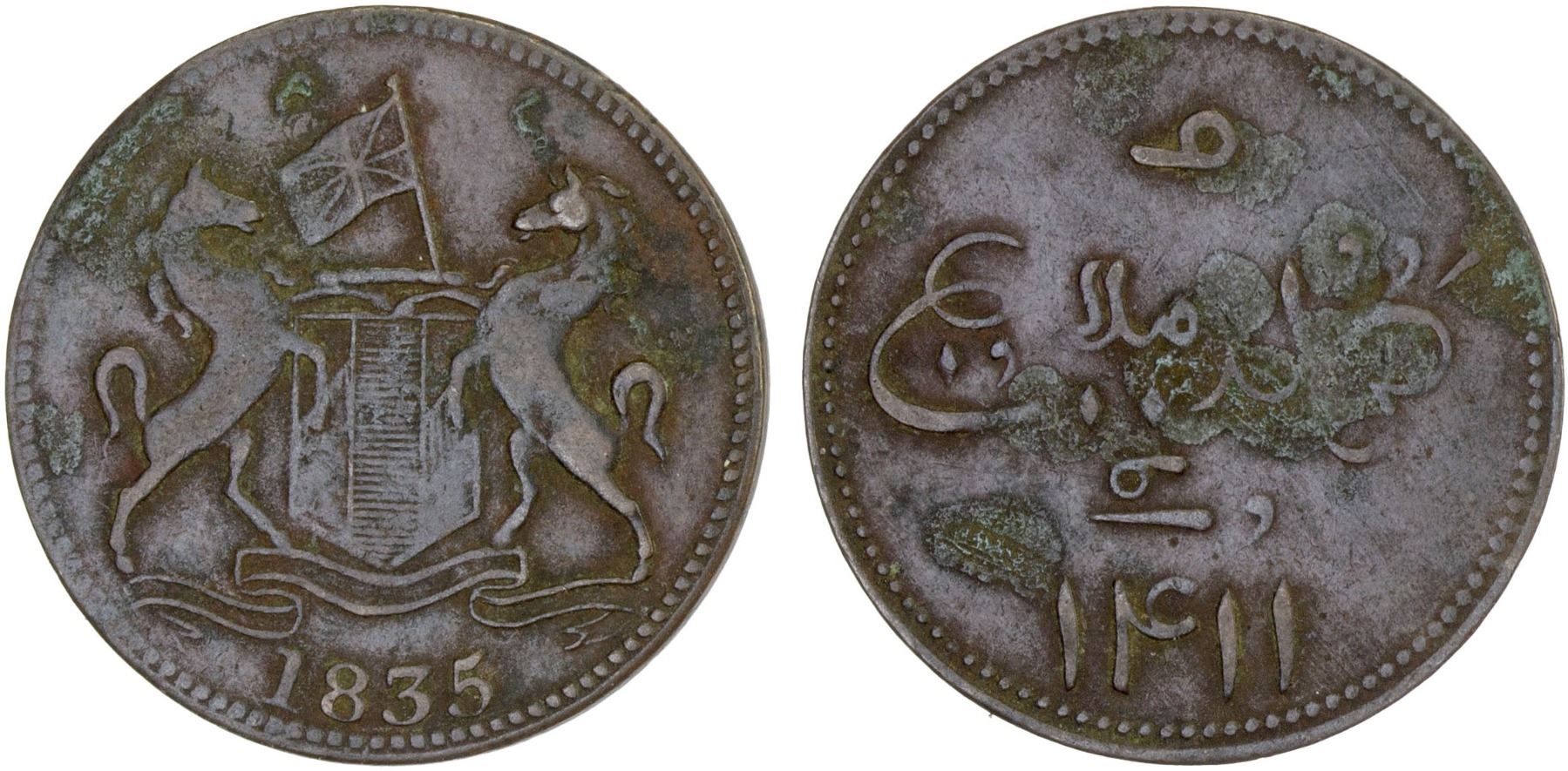 SULTANA: AE keping, 1835/"AH1411", KM-Tn7, SS-SS15, type with a single Union Jack flying left, some spots of light discoloration, VF. These coins were not official currency of any state. They were first issued in the early 1800s by British merchants at Singapore, to alleviate base coin shortage, before spreading to various parts of the Malay Archipelago. To circumvent confiscation attempts by colonial authorities (particularly the Dutch), British merchants use inscriptions that refer to locations that are vague, fictitious, or unaffiliated to Europeans. In this manner, legally it could not be argued that the tokens were intended for circulation in colonial territories. This token's "Island of Sultana" is a fictitious location. They were issued after a Dutch proclamation in 15th October 1835 to confiscate a previous issue with "Island of Sumatra" inscription.