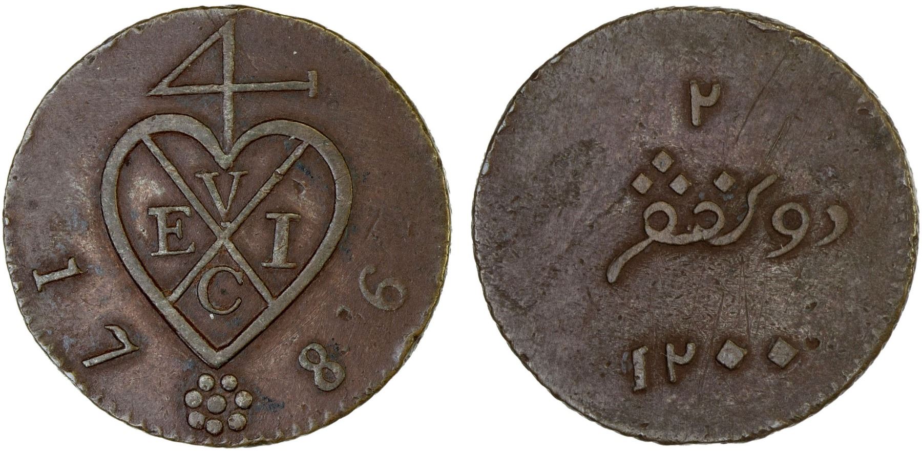 SUMATRA: AE 2 keping, 1786/AH1204, KM-258, East India Company issue struck at the Soho mint, Birmingham, oblique edge milling, VF-XF.