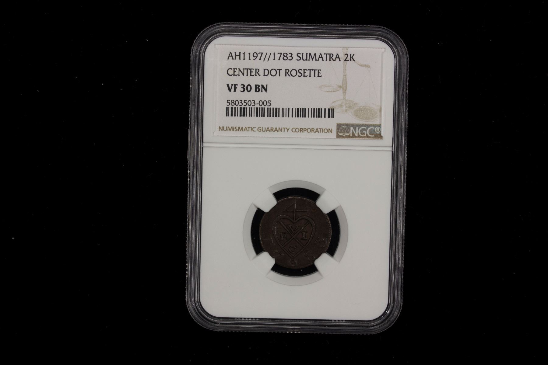 SUMATRA: East India Company, AE 2 kepings, 1783/AH1197, KM-256, with reverse center dot, one-year type, pleasing appearance, NGC graded VF30 BN.