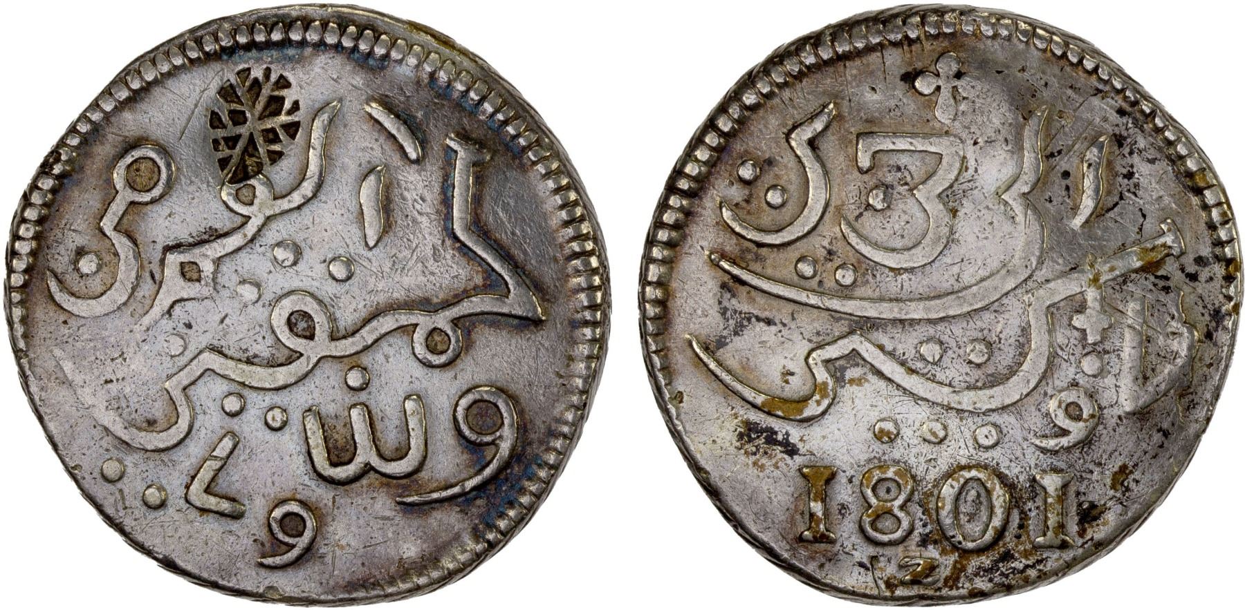 SUMENEP: AR rupee (12.70g), ND (ca. 1820), KM-191.3, Madura Star countermark on 1801-Z Java rupee (KM-208) host, lightly polished, VF on VF host, ex Jürgen M. Wilmes Collection.