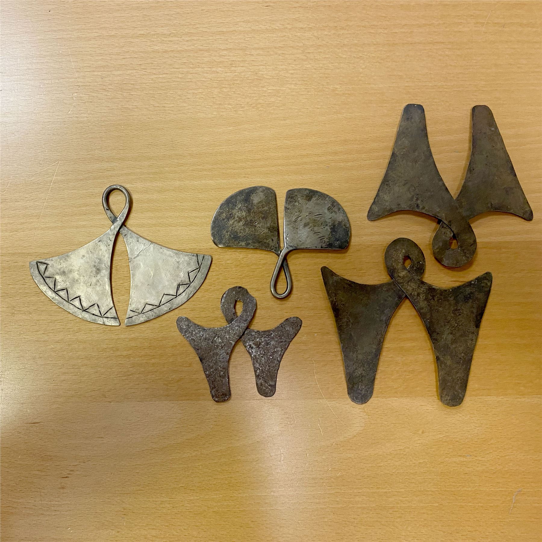 INDONESIA: Sumba, LOT of 5 marangga pendants, Opitz (2011) p.345 (plate examples), including two decorated silver examples (127mm, 42.63g; 95mm, 44.96g), made from a metal rod with flattened, axe-shaped ends and a waist twisted into a loop, similar in shape and production method to the gold taka pendant of Flores, as well as three base-metal examples made with thin sheets of brass and iron; retail value $300, lot of 5 pieces, ex Charles Opitz Collection. Visit www.traditionalmoney.com for a downloadable copy of Odd & Curious and Traditional Money (Opitz, 2011).