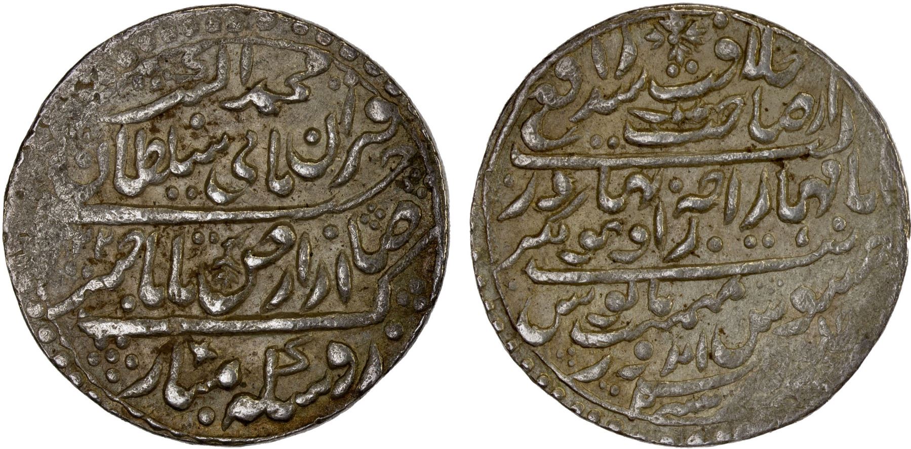 INDORE: Jaswant Rao, 1798-1811, AR nazarana rupee (14.68g), Indore, AH1222, KM-8, Persian legends, citing the Mughal Muhammad Akbar II on obverse and Jaswant Rao on reverse, minor peripheral weakness, XF.