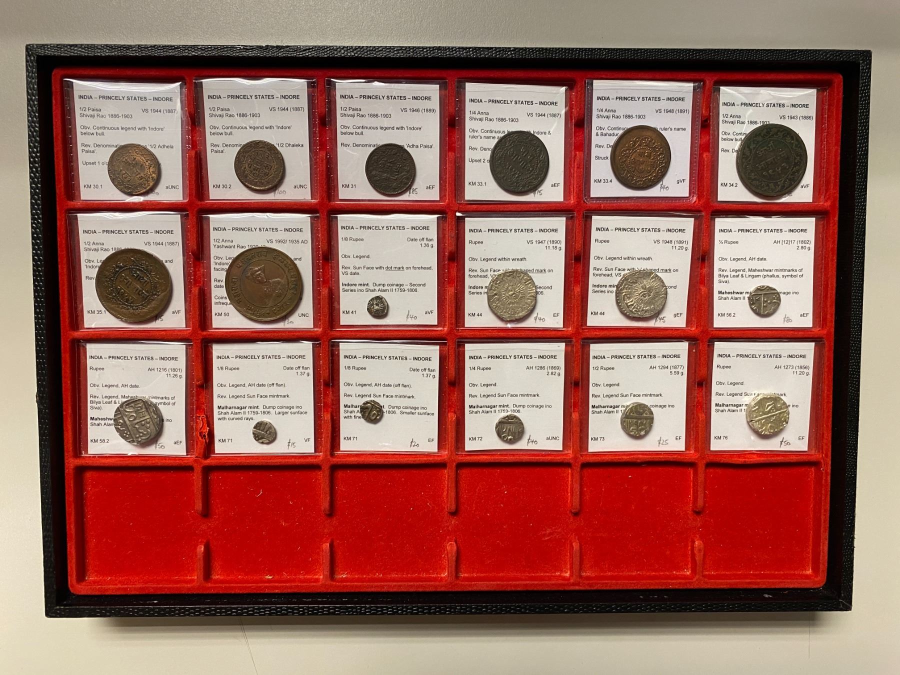 INDORE: LOT of 10 silver & 8 copper coins, Silver: KM-41, 44 (2 pcs), 56.2 (Maheshwar AH1217, EF), 58.2 (AH1218, EF), 71 (2 pcs), 72, 73, and 76; average VF condition, most with legible date; and Copper: KM-30.1 (AU), 30.2 (AU), 31 (EF), 33.1 (VF), 33.4 (off center strike, cleaned VF), 34.2 (Fine), 35.1 (VF), and 50 (AU); all fully identified by the consignor; retail value $475, lot of 18 pieces, ex Ian Todd Collection.